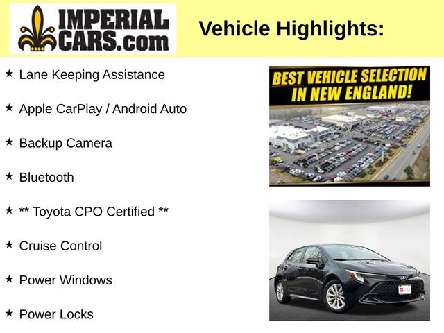 Discover the perfect blend of style, efficiency, and advanced features in the 2023 Toyota Corolla Hatchback SE. This meticulously maintained, low-mileage vehicle is a true standout, offering an exceptional driving experience and a wealth of premium amenities.Boasting a sleek black exterior, the Corolla Hatchback SE commands attention on the road. Its impressive list of features includes: Lane Keeping Assistance Apple CarPlay / Android Auto Backup Camera Bluetooth Cruise Control Power Windows and Locks Steering Wheel Radio Controls Aluminum WheelsComplementing these desirable features are a host of additional enhancements, such as the ALL WEATHER FLOOR LINER PACKAGE, BLACK EMBLEM OVERLAYS, TRD AIR FILTER, and FIRST AID KIT, further elevating the vehicle's capabilities and convenience.Powered by a robust 2.0L I4 engine and equipped with a fuel-efficient CVT transmission, this Corolla Hatchback SE delivers an exceptional blend of performance and efficiency, achieving an impressive 32 MPG in the city and 41 MPG on the highway. The vehicle's front-wheel-drive configuration ensures confident and responsive handling, making it a joy to drive in any condition.As a Toyota Certified Pre-Owned (CPO) vehicle, this Corolla Hatchback SE has undergone a rigorous 160-point inspection and comes with a comprehensive warranty package, providing you with the peace of mind and assurance you deserve. The CPO program includes a 12-month/12,000-mile Limited Comprehensive Warranty, an 84-month/100,000-mile Powertrain Limited Warranty, and 7 years/100,000 miles of Roadside Assistance, all backed by the trusted Toyota brand.With its exceptional features, impressive performance, and the unparalleled quality assurance of Toyota's CPO program, this 2023 Corolla Hatchback SE is an exceptional value that simply cannot be overlooked. Experience the difference for yourself and schedule a test drive today. We're confident you'll be impressed by this remarkable vehicle.