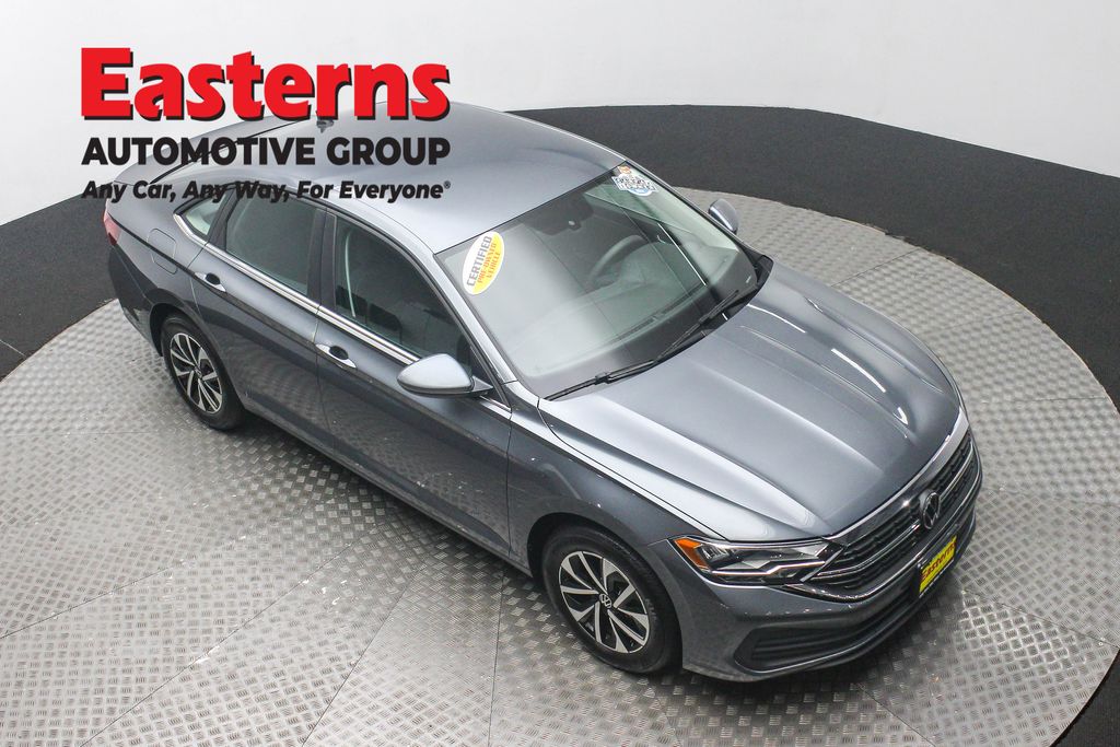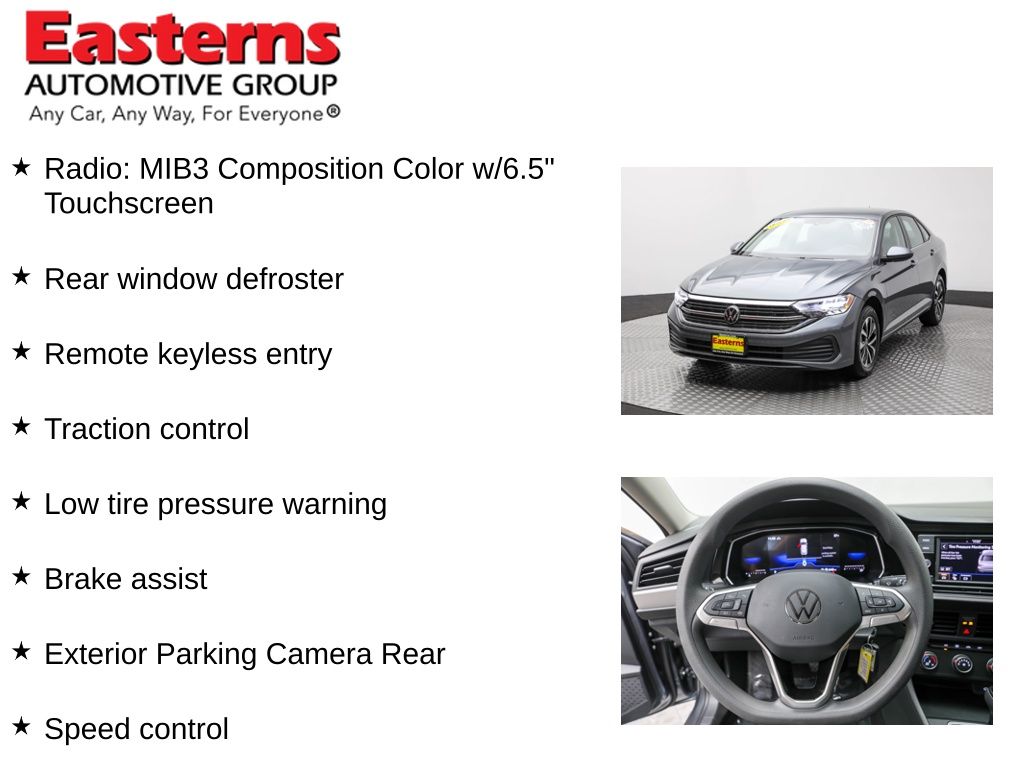 2023 Volkswagen Jetta 1.5T S Platinum Gray Metallic FWD 8-Speed Automatic with Tiptronic Black Cloth, Brake assist, Exterior Parking Camera Rear, Heated door mirrors, Heavy Duty Trunk Liner w/VW CarGo Blocks, Low tire pressure warning, Power door mirrors, Radio: MIB3 Composition Color w/6.5 Touchscreen, Rear window defroster, Remote keyless entry, Rubber Monster Mats Kit (Set of 4), Speed control, Split folding rear seat, Traction control, Wheels: 16 2-Tone Machined Alloy.Odometer is 26075 miles below market average! CARFAX One-Owner. 31/41 City/Highway MPGEasterns Automotive Group has 11 locations that has sold thousands of used cars in the Maryland, DC, and Virginia communities for over the past 35 years. Every Easterns vehicle has passed a rigorous Multi-Point Quality Certification, so you can buy with confidence. Start your purchase online to save time by visiting Easterns.com... Any Car, Any Way, For Everyone.