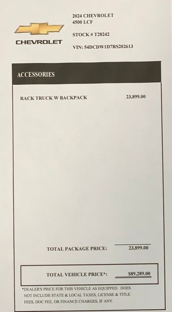 Artic White 2024 Chevrolet 4500 HG LCF Gas RWD 6-Speed Automatic 6.6L V8Dealer Discount of $13,390 off MSRP In stock vehicles only. Any dealer installed accessories are additional. List price includes GM Factory Rebates off vehicle original GM Factory MSRP. Price includes:$3500 - GM Envolve Consumer Cash Program. Exp. 03/31/2026