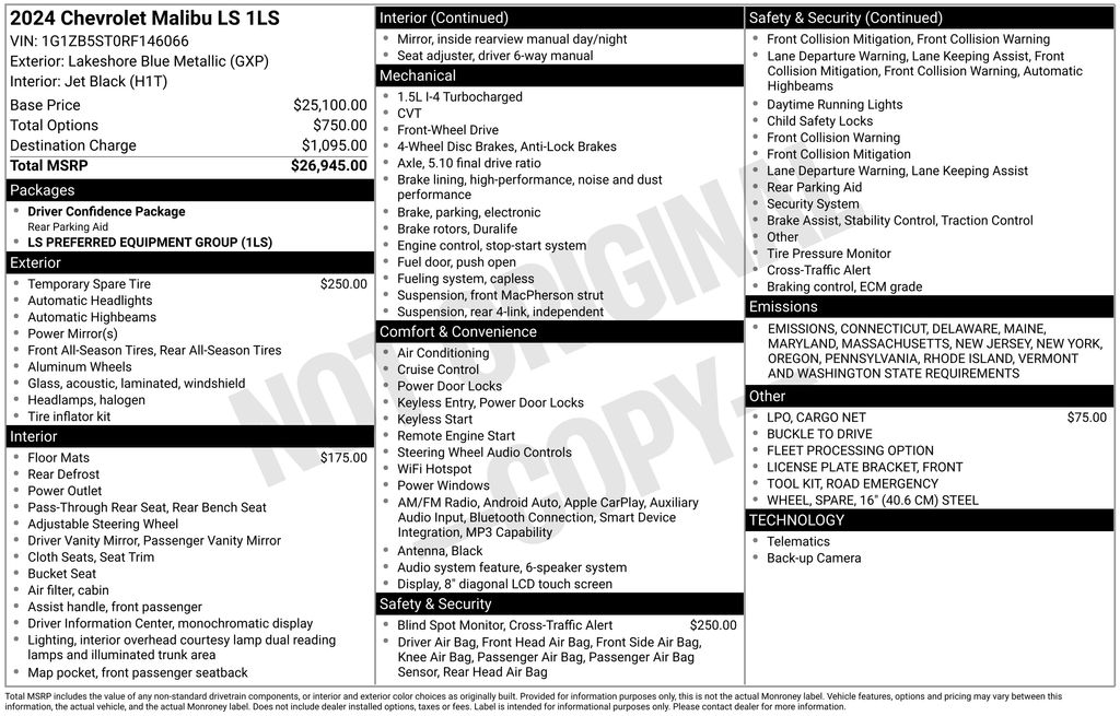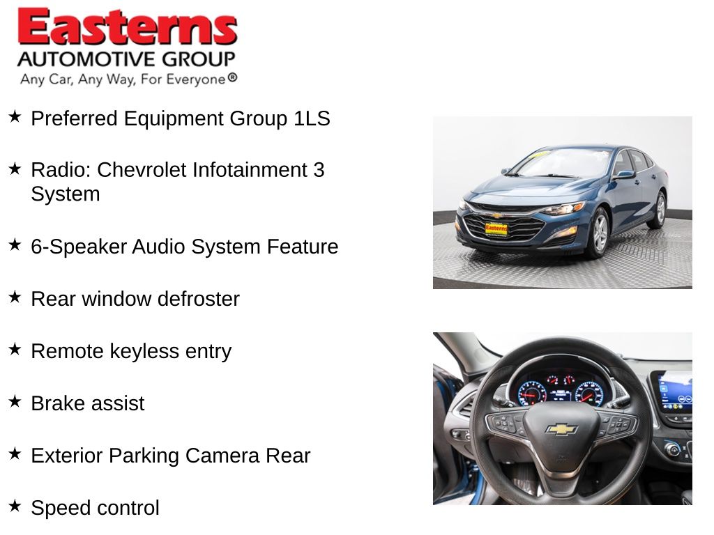 2024 Chevrolet Malibu LS 1LS Lakeshore Blue Metallic FWD CVT Black Cloth, 16 Aluminum Wheels, 6-Speaker Audio System Feature, All-Weather Floor Mats, Brake assist, Exterior Parking Camera Rear, Lane Change Alert w/Side Blind Zone Alert, Power door mirrors, Preferred Equipment Group 1LS, Radio: Chevrolet Infotainment 3 System, Rear Cross Traffic Alert, Rear window defroster, Remote keyless entry, Speed control, Split folding rear seat, Wireless Apple CarPlay/Android Auto.Clean CARFAX. CARFAX One-Owner. 28/36 City/Highway MPGEasterns Automotive Group has 11 locations that has sold thousands of used cars in the Maryland, DC, and Virginia communities for over the past 35 years. Every Easterns vehicle has passed a rigorous Multi-Point Quality Certification, so you can buy with confidence. Start your purchase online to save time by visiting Easterns.com... Any Car, Any Way, For Everyone.
