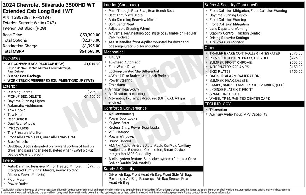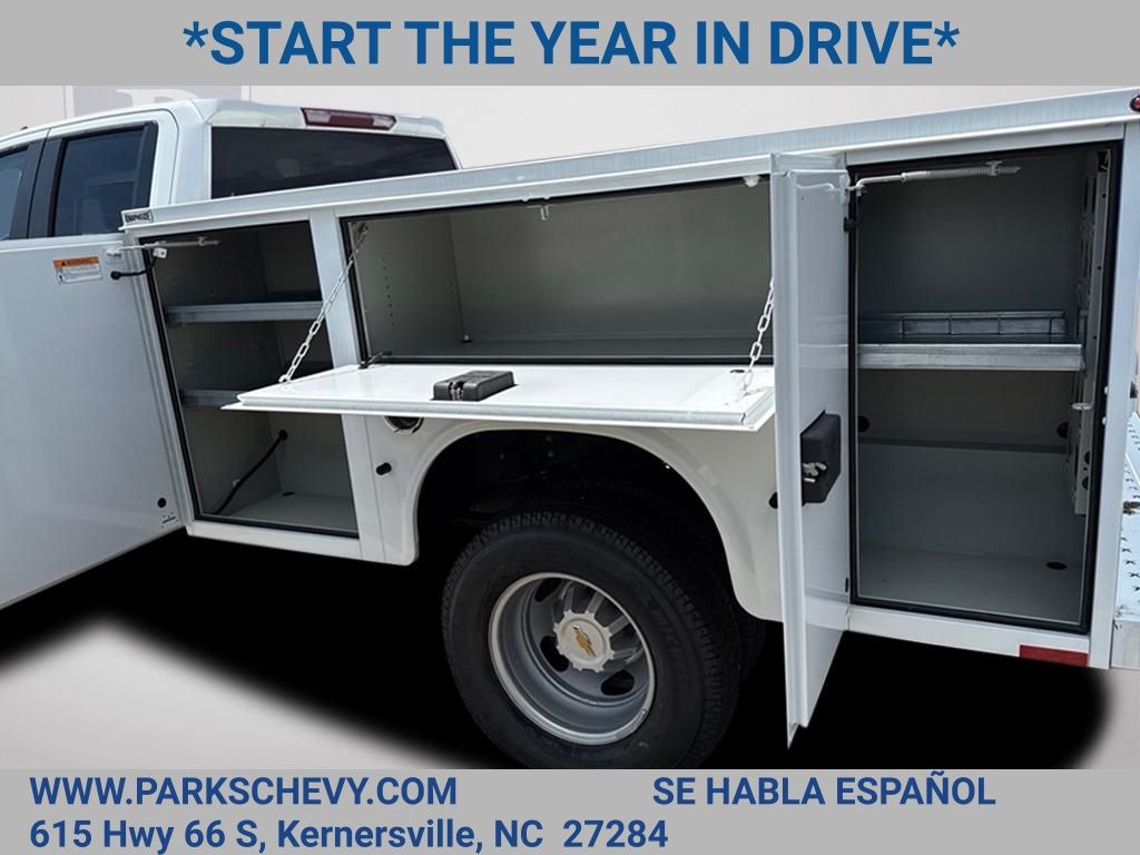 2024 Chevrolet Silverado 3500HD Work Truck 4WD Summit White 8FT Knapheide Service BodyInstalled Commercial Upfit Includes:Manufacturer: KnapheideBody Type: Service TruckBody Line: Steel Service BodyBody Model: 696D54Body Material: SteelBody Height: 40Body Width: 94Body Length: 8'Body Inside Width: 54Body Weight: 1288Compartment Depth: 20Floor Description: Return Flange Floor DesignLighting Type: LEDLighting Description: Surface Mount S/T/T and B/U LightLighting Location: ExteriorCamera Description: Factory Backup CameraBumper Description: Step BumperBumper Location: RearSteel Service Body Features: With a rugged steel construction and external storage for your tools and equipment, the Service Body is a key component in your day-to-day productivity.The external compartments offer protection from outside elements and allow technicians to access their equipment without having to climb into the truck bed.Staying organized both on and between job sites is important. Get maximum efficiency with a Knapheide Service Body.The 2024 Chevrolet Silverado 3500HD Work Truck is built for serious work, powered by a 6.6L V8 paired with a 10-speed automatic transmission and 3.73 rear axle ratio. This RWD model offers a GVWR of 14,000 lbs and features an 8FT Knapheide Service Body for added utility.Finished in Summit White with a Jet Black vinyl interior, it includes Power Windows & Locks, Remote Keyless Entry, Cruise Control, and Air Conditioning. Stay connected with a Touchscreen Radio featuring Apple CarPlay & Android Auto, Bluetooth, Wi-Fi Hotspot Capability, and a Backup Camera.Equipped with the WT Convenience Package, Suspension Package, and a 220 Amp Alternator, this Silverado is ready to perform on the jobsite or out on the road.Price excludes applicable tax, tag, and fees.Price may not include dealer installed accessories.Contact us online at www.ParksChevy.com or give us a call to get your questions answered, request a personalized quote, or schedule your test drive today. Parks Chevrolet Kernersville is proud to serve customers across North Carolina. Our prices cannot be beat and our service is always backed by the Parks Promise. Come visit us at 615 NC-66, Kernersville, NC 27284! We offer a wide selection of New Chevrolet, Commercial Chevrolet Utility Trucks, and Pre-Owned Vehicles.