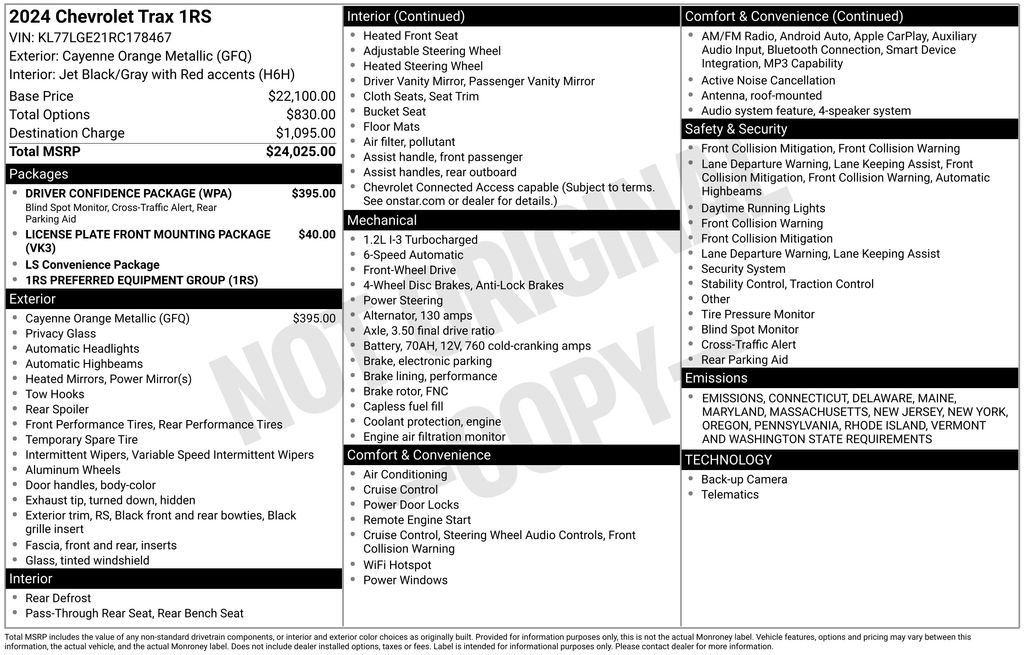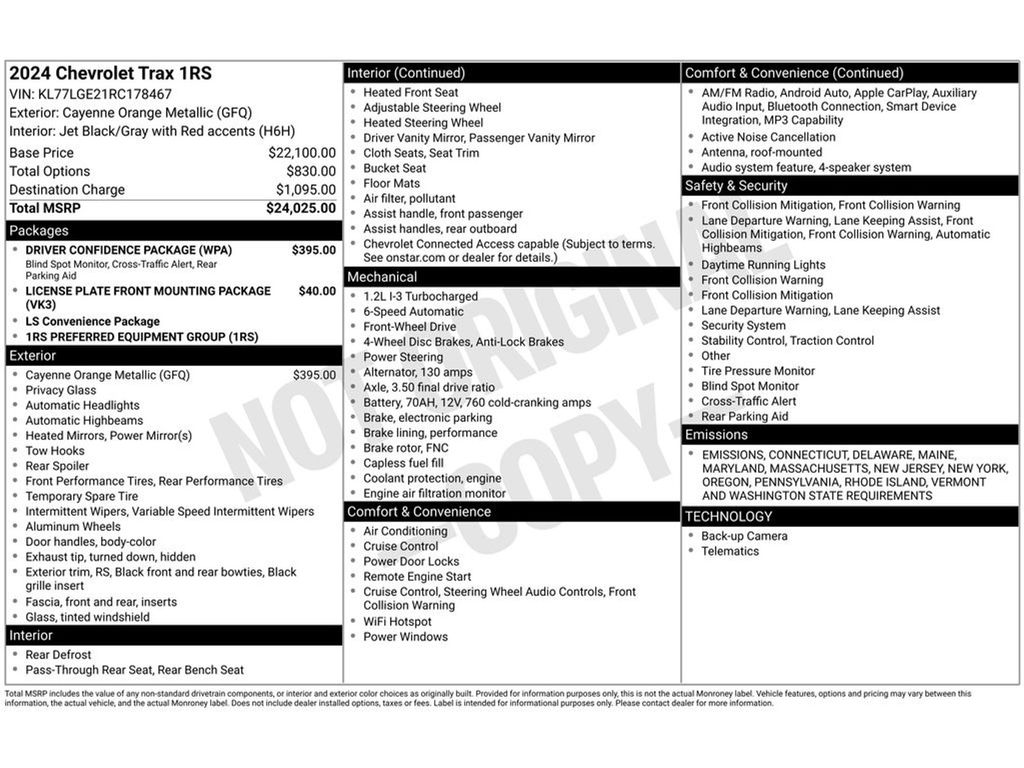 CARFAX One-Owner. Clean CARFAX.**CAR FAX 1 OWNER**, **CLEAN CAR FAX**, **VISION NISSAN GREECE**, Remote Engine Start, Flat-Bottomed Steering Wheel, LED Daytime Running Lights, Automatic Emergency Braking, Chevy Safety Assist, Lane Keep Assist with Lane Departure Warning, Front Pedestrian Braking, 4 Speakers, 4-Speaker Audio System Feature, Alloy wheels, Brake assist, Driver Confidence Package, Exterior Parking Camera Rear, Fully automatic headlights, Heated door mirrors, Heated Driver & Front Passenger Seats, Heated steering wheel, Lane Change Alert w/Side Blind Zone Alert, Power door mirrors, Radio: Chevrolet Infotainment 3 System w/AM/FM, Rear Cross-Traffic Alert, Rear Park Assist, Rear window defroster, SiriusXM, Steering wheel mounted audio controls.Do not forget with EVERY VEHICLE purchased at any of the 10 Vision locations you will receive -LIFETIME FREE INSPECTIONS YOU AND THE FAMILY -DISCOUNT COUPONS FOR SERVICE AND ACCESSORIES GOOD UP TO $250 THE FOLLOWING NO CHARGE ITEMS HAVE ALREADY BEEN ADDED TO THIS VEHICLE FOR THE PROTECTION OF THE DEALERSHIP AGAINST ENVIRONMENTAL DAMAGES AND THEFT. THESE PRODUCTS ARE AVAILABLE TO HAVE A WARRANTY ADDED UP TO 6 YEARS FROM PURCHASE) -LOJACK SYSTEM INSTALLED (NOT ACTIVE UNTIL PLAN PURCHASED) -RUSTPROOFING -INTERIOR PROTECTION PACKAGE APPLIED -PAINT PROTECTION- PROTECTING THE POUROUS SURFACE OF YOUR VEHICLE FROM ENVIRONMENTAL DAMAGES STOP IN TO ANY OF OUR LOCATIONS TODAY WE LOOK FORWARD TO SERVING YOU, YOUR FAMILY, AND THE COMMUNITY!Cayenne Orange Metallic 2024 Chevrolet Trax 1RS 6-Speed Automatic 1.2L Ecotec Turbo DOHC DI w/VVT FWD28/32 City/Highway MPGAwards: * Car and Driver 10 BestCar and Driver, January 2017.