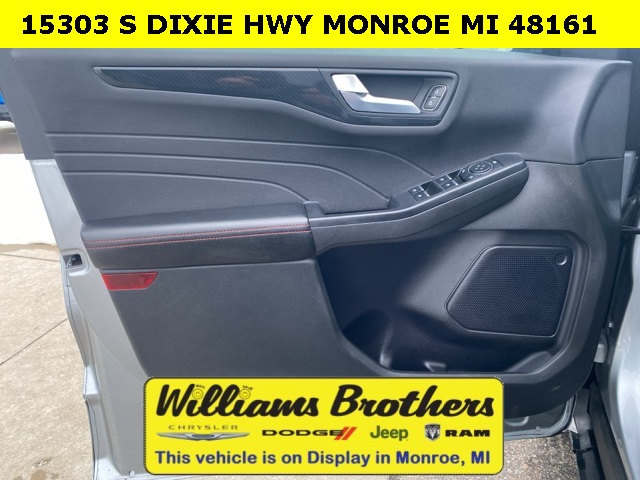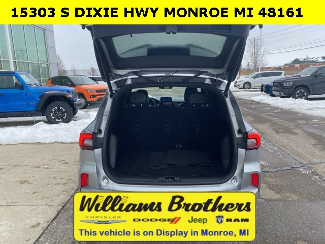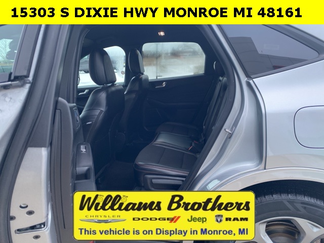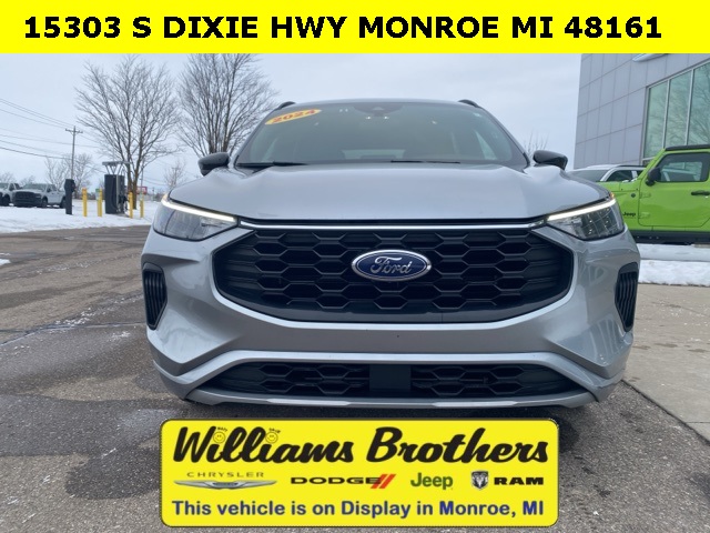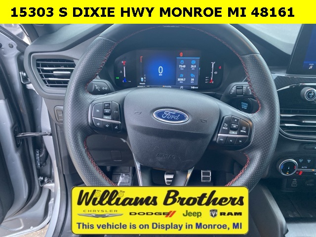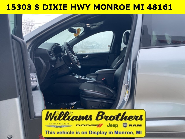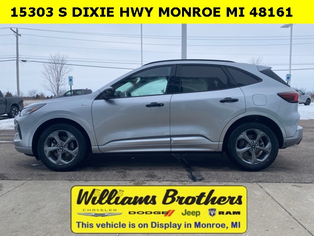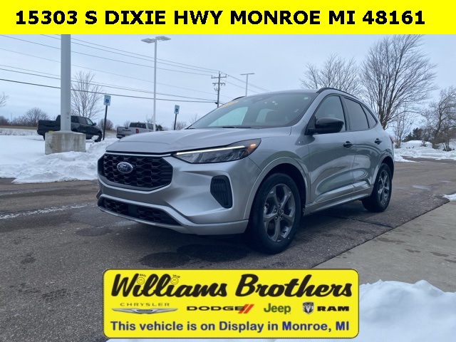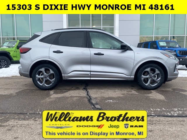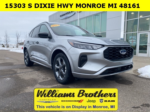 27/34 City/Highway MPG2024 Ford Escape ST-Line Silver Metallic ST-Line FWD 8-Speed Automatic 1.5L EcoBoostCold Weather Package (Heated Front Row Seats, Heated Sideview Mirrors, Heated Steering Wheel, and Remote Starter System), Equipment Group 300A, 3.81 Axle Ratio, 4-Wheel Disc Brakes, 6 Speakers, ABS brakes, Air Conditioning, Alloy wheels, AM/FM radio: SiriusXM, AM/FM Stereo, Auto High-beam Headlights, Automatic temperature control, Brake assist, Bumpers: body-color, Compass, Delay-off headlights, Driver door bin, Driver vanity mirror, Dual front impact airbags, Dual front side impact airbags, Electronic Stability Control, Emergency communication system: SYNC 4 911 Assist, Exterior Parking Camera Rear, FordPass Connect, Four wheel independent suspension, Front anti-roll bar, Front Bucket Seats, Front Center Armrest, Front dual zone A/C, Front reading lights, Fully automatic headlights, Illuminated entry, Knee airbag, Low tire pressure warning, Occupant sensing airbag, Outside temperature display, Overhead airbag, Overhead console, Panic alarm, Passenger door bin, Passenger vanity mirror, Power door mirrors, Power driver seat, Power Liftgate, Power steering, Power windows, Radio data system, Rear anti-roll bar, Rear reading lights, Rear seat center armrest, Rear window defroster, Rear window wiper, Remote keyless entry, Roof rack: rails only, Speed control, Speed-sensing steering, Speed-Sensitive Wipers, Split folding rear seat, Spoiler, Sport steering wheel, Steering wheel mounted audio controls, SYNC 4, Tachometer, Telescoping steering wheel, Tilt steering wheel, Traction control, Trip computer, Variably intermittent wipers, Vinyl/Cloth Front Sport Contour Bucket Seats, and Wheels: 18 Rock Metallic Painted Aluminum.