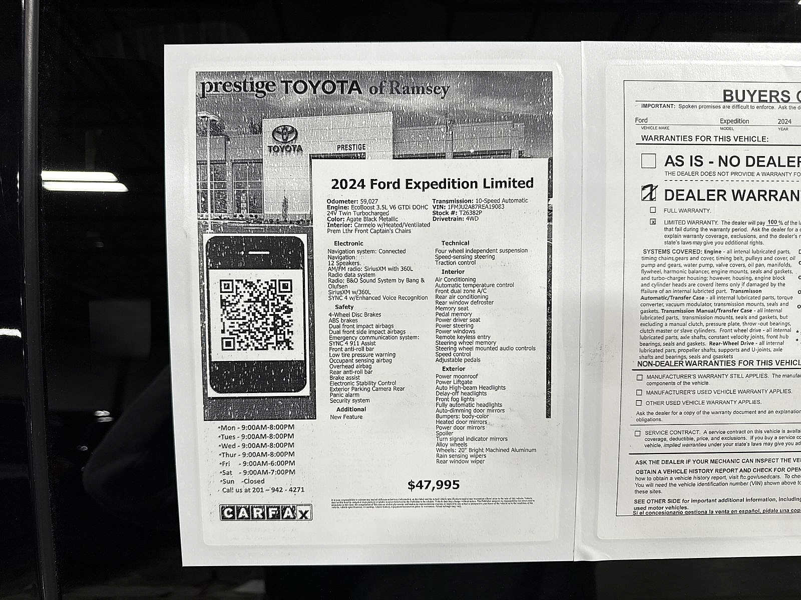 Expedition Limited, 4D Sport Utility, EcoBoost 3.5L V6 GTDi DOHC 24V Twin Turbocharged, 10-Speed Automatic, 4WD, Agate Black Metallic, Carmelo w/Heated/Ventilated Prem Lthr Front Captains Chairs. Clean CARFAX. CARFAX One-Owner. Agate Black Metallic 2024 Ford Expedition Limited 4WD 10-Speed Automatic EcoBoost 3.5L V6 GTDi DOHC 24V Twin Turbocharged<br><br><br>This 2024 Ford Expedition Limited will not make it to the weekend!! CALL NOW to reserve your test drive!! (844) 838-7075 Please Visit www.PrestigeToyota.com for further details. Price does not include licensing costs, registration fees, taxes and dealer doc fee of $999 which are to be paid by the consumer.