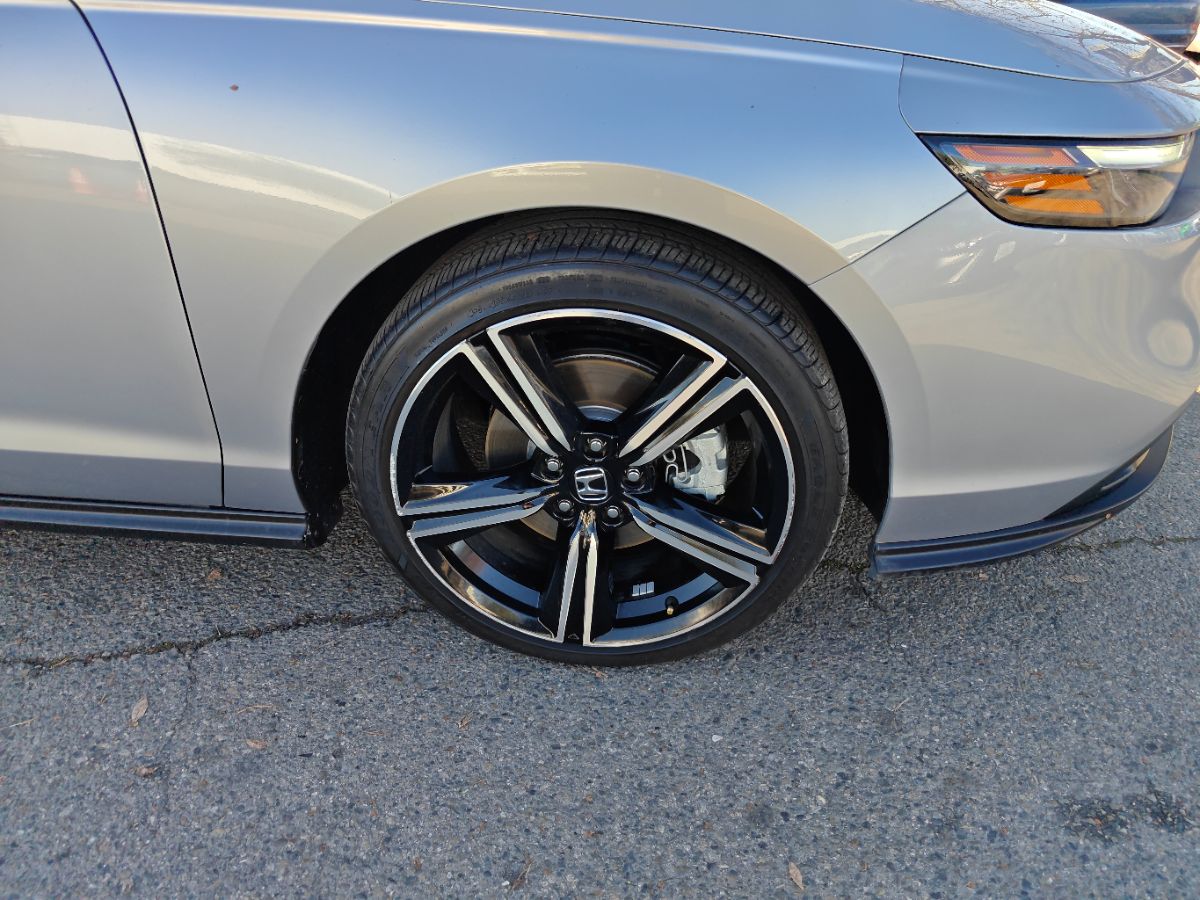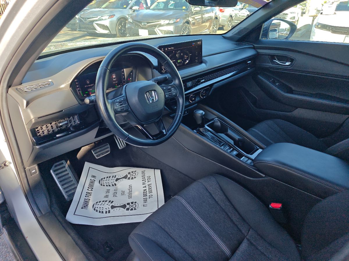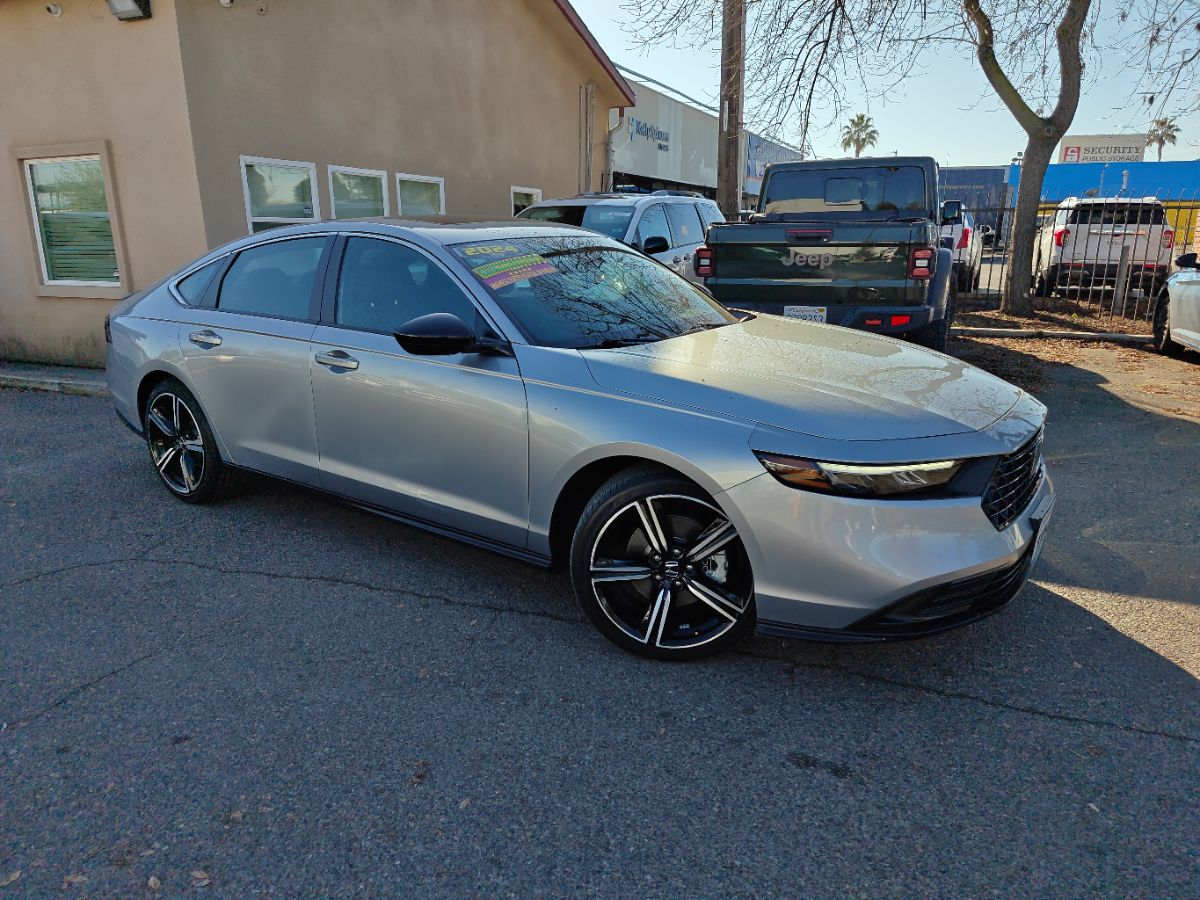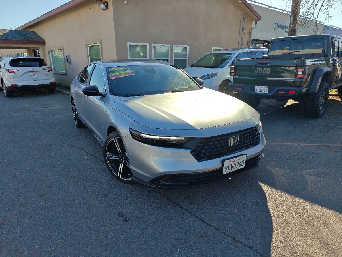 Our one owner 2024 Honda Accord Sport Hybrid Sedan with low miles can enhance performance, efficiency, and style in Solar Silver Metallic! Powered by 2.0 Liter 4 Cylinder and 2 Electric Motors offering a combined 204hp to an eCVT with Sport and Individual Modes. A Motion Management System is standard for comfortable cornering, and this Front Wheel Drive sedan sees nearly 46mpg in the city. Designed for an adrenaline rush, our Accord delivers with a gloss-black rear spoiler, matching side sills, 19-inch alloy wheels, a power sunroof, and LED lighting. Honda has a winner with this one! Top-shelf amenities await in our terrific Sport Hybrid cabin. It helps you travel in dynamic comfort with supportive cloth front seats, 10-way power for the driver, a leather-wrapped steering wheel, dual-zone automatic climate control, sport pedals, and keyless access/ignition. Activate the infotainment system to enjoy a 12.3-inch touchscreen, a 10.2-inch driver display, Alexa Built-in, wireless Apple CarPlay/Android Auto, WiFi compatibility, Bluetooth, and eight-speaker audio. Honda helps you prepare for the road ahead by providing automatic braking, adaptive cruise control, blind-spot monitoring, lane-keeping assistance, a multi-angle rearview camera, forward collision warning, and more. A popular choice for demanding owners, our Accord Sport Hybrid puts your needs first! Save this Page and Call for Availability. We Know You Will Enjoy Your Test Drive Towards Ownership!