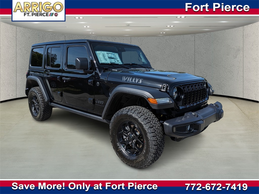 Black Clearcoat 2024 Jeep Wrangler Willys 4WD 8-Speed Automatic 3.6L V6 24V VVT Wrangler Willys, 4D Sport Utility, 3.6L V6 24V VVT, 8-Speed Automatic, 4WD, Black Clearcoat, Black Cloth.Come see the all new Arrigo CDJR of Fort Pierce. HERE YOU CAN SAVE BIG. WE HAVE SOME OF THE BEST PRICES IN THE USA. Top dollar for your trade!! Best APR with approved credit and ZERO DOWN AVAILABLE, JUST SIGN AND DRIVE!. Come to Arrigo Fort Pierce where you will be treated like family.