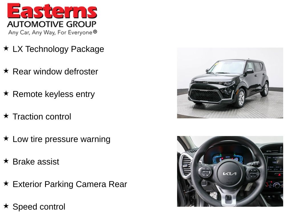 2024 Kia Soul LX Fusion Black FWD CVT 6.5J x 16 Alloy Wheels, Apple CarPlay & Android Auto, Blind-Spot Collision-Avoidance Assist, Brake assist, Carpeted Floor Mats, Exterior Parking Camera Rear, Lane Change Assist, Low tire pressure warning, LX Technology Package, Power door mirrors, Rear Cross-Traffic Collision Avoidance Assist, Rear window defroster, Rear window wiper, Remote keyless entry, Speed control, Split folding rear seat, Traction control, Woven & Tricot Cloth Seat Trim.Clean CARFAX. CARFAX One-Owner. 29/35 City/Highway MPGEasterns Automotive Group has 11 locations that has sold thousands of used cars in the Maryland, DC, and Virginia communities for over the past 35 years. Every Easterns vehicle has passed a rigorous Multi-Point Quality Certification, so you can buy with confidence. Start your purchase online to save time by visiting Easterns.com... Any Car, Any Way, For Everyone.