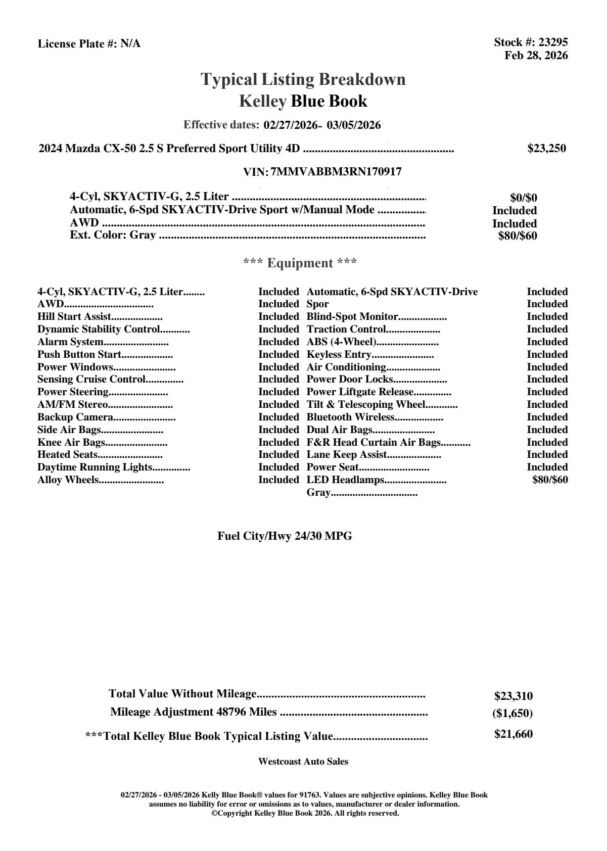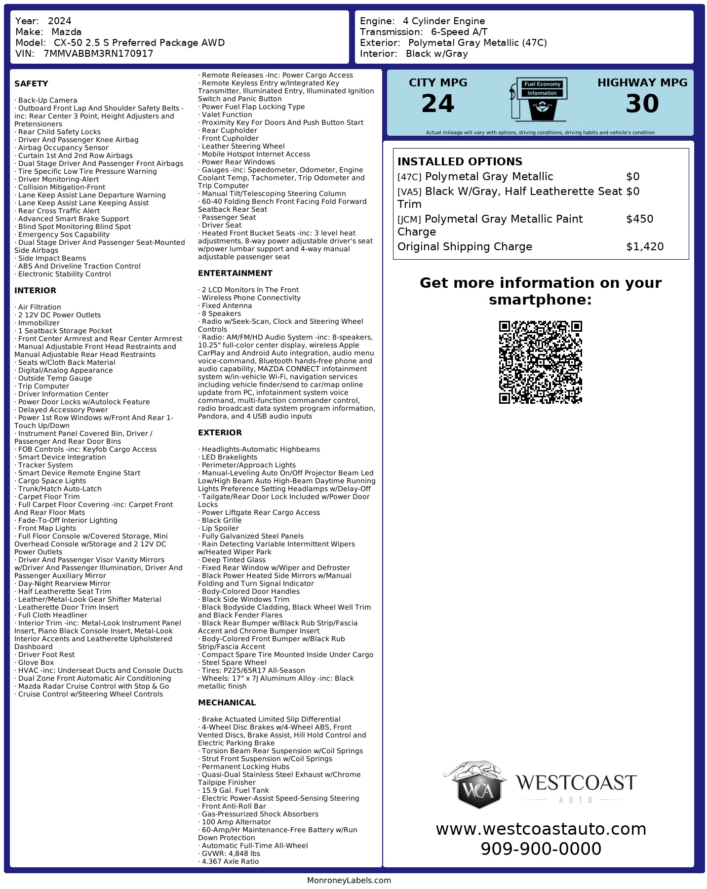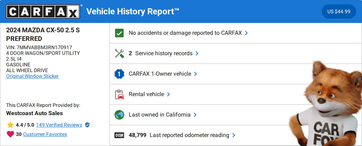 Our One Owner 2024 Mazda CX-50 2.5 S Preferred AWD is prepared for premium adventures with a bold Polymetal Gray Metallic design! Motivated by a 2.5 Liter Cylinder providing 187hp to a 6 Speed Automatic transmission for everyday excitement. This All Wheel Drive SUV also helps push your limits with Sport and Off-road modes, achieving nearly 30mpg on the highway. Our CX-50 sends a clear message you care about style with its LED lighting, heated power mirrors, a roof-mounted spoiler, bright dual exhaust outlets, rain-sensing wipers, a power liftgate, and alloy wheels. Get ready to relax and enjoy the ride in our Preferred cabin, where you'll find heated leatherette front seats with eight-way power for the driver, a leather-wrapped steering wheel, dual-zone automatic climate control, keyless access, and pushbutton ignition. Tech lovers can take note of the 10.25-inch center display, 7-inch driver display, wireless Apple CarPlay/Android Auto, WiFi compatibility, Bluetooth, and eight-speaker audio for easy connectivity. Drive safer and smarter with sophisticated Mazda features like adaptive cruise control, lane-keeping assistance, automatic emergency braking, rearview camera, driver attention monitor, blind-spot monitoring, rear cross-traffic alert, and more. You can feel better in our fun-to-own Mazda CX-50 2.5 S Preferred! Save this Page and Call for Availability. We Know You Will Enjoy Your Test Drive Towards Ownership! Great quality, easy financing and affordable prices aren't the only things that make Westcoast Auto Sales the first choice of many discerning auto buyers. Stop in and See California's Dealer of the Year! 72 HOUR FLASH EVENT WESTCOAST AUTO CPO-Quality Vehicles. Market-Driven Pricing. Serious Approvals. For 72 hours, were spotlighting some of the cleanest inventory in Southern California. At West Coast Auto, we specialize in exceptionally well-kept, fully inspected vehicles selected for condition, options, and overall quality. Market-Positioned Pricing Aggressive Financing Approvals Credit Challenge Welcome Trade-In Assistance Fast, Professional Buying Experience This event is built for buyers who care about quality, strong approvals, and a smooth transaction.