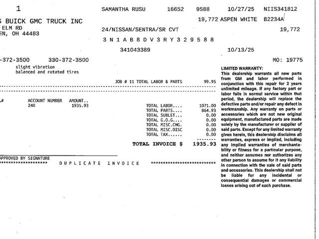 2024 Nissan Sentra 2.0 SR CVT - Sporty Efficiency20k Miles Clean CARFAX 1 Owner Local TradeExperience the perfect blend of athletic style and everyday efficiency in this 2T White/Black Roof 2024 Nissan Sentra SR.Powered by a responsive 2.0L 4-cylinder engine and featuring the SR Premium Package, this sedan offers a high-end feel with its leatherette seating and Bose premium audio.Whether you're commuting through Warren or Austrian, this one-owner local trade delivers a premium driving experience with impressive fuel economy.Performance Mechanical2.0L DOHC 4-Cylinder Engine: Delivers a balanced 149 horsepower and 145 lb-ft of torque. Xtronic CVT (Continuously Variable Transmission): Optimized for smooth acceleration and maximum efficiency. Independent Multilink Rear Suspension: Provides a refined and sporty handling profile. Idle Start/Stop: Helps conserve fuel during city driving. 18 Black Alloy Wheels: Adds a bold, custom look to the SR's sporty stance.SR Premium Comfort FeaturesPower Sliding Glass Moonroof: Features a tilt function to brighten the sport-inspired cabin. 8-Speaker Bose Premium Audio: Delivers crystal-clear sound throughout the interior. Leatherette Seats 6-Way Power Driver's Seat: Premium seating with 2-way power lumbar support for long-distance comfort. Heated Front Seats Heated Steering Wheel: Essential features for comfortable winter mornings in Ohio. Dual Zone Automatic Climate Control: Allows personalized temperature settings for the driver and passenger. Intelligent Around View Monitor: Provides a 360-degree bird's-eye view for effortless parking.Advanced Technology Safety8 Color Touch-Screen Display: Features NissanConnect with Wireless Apple CarPlay and Android AutoT. Safety Shield 360: Includes Automatic Emergency Braking with Pedestrian Detection, Rear Automatic Braking, and Blind Spot Warning. Intelligent Cruise Control: Helps maintain a safe following distance on the highway. Dual Camera Dash Cam: Factory-installed drive recorder for added peace of mind. Nissan Intelligent Key : Includes push-button ignition for seamless entry and start.Why Buy This Sentra at Sims Auto Park?Serving Warren, Austintown, and Hermitage PA, Sims Auto Park is your destination for quality one-owner vehicles like this 2024 Sentra SR. This local trade has been meticulously inspected to ensure it meets our high standards for reliability and performance.Drive a sedan that stands out from the crowd! Call 330-372-3500 or visit us at 3100 Elm Rd NE, Warren, OH 44483 orhttps://www.simsautopark.com/to schedule your test drive today.