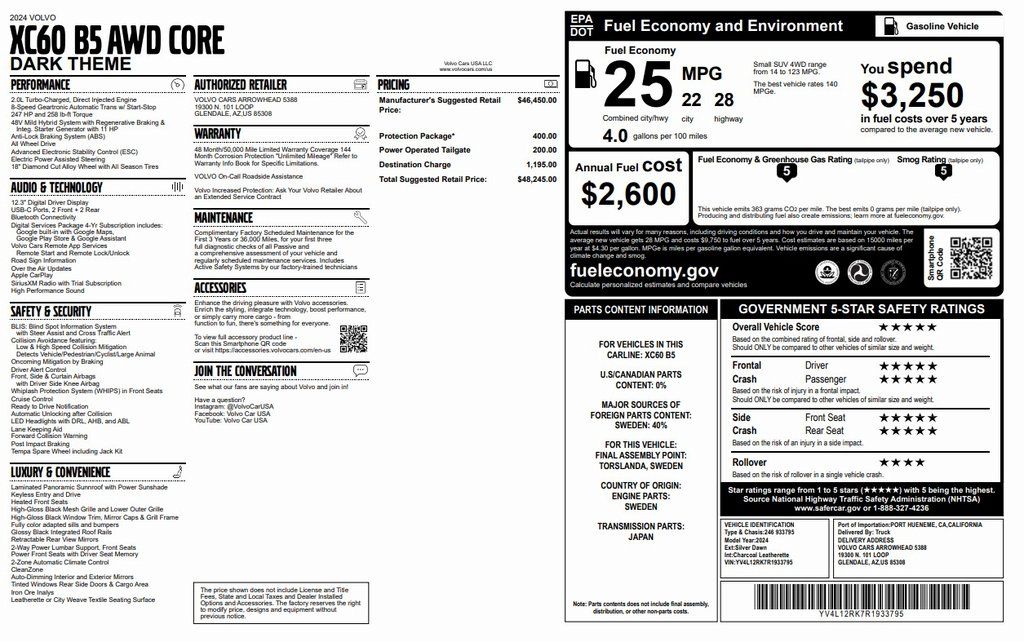 BILL LUKE CERTIFIED! NO HIDDEN FEES! ALL RECONDITIONING COSTS ARE FULLY INCLUDED IN OUR PRICES. ONE OWNER! LEASE RETURN!PANORAMIC ROOF, NAVIGATION, 18 WHEEL, LEATHER AND 12.3 TOUCHSCREEN DISPLAY!Experience Scandinavian luxury and advanced safety in the Silver Dawn Metallic 2024 Volvo XC60 B5 Core AWD, powered by a 2.0L I4 Turbocharged engine with an Automatic Geartronic transmission for smooth, efficient performance in any condition. This elegant SUV combines modern design with confidence-inspiring technology, featuring Volvos legendary AWD system, 18-inch diamond-cut alloy wheels with all-season tires, and the Protection Package with all-weather floor mats and cargo tray. Inside, enjoy a refined cabin equipped with a 12.3-inch digital driver display, Bluetooth connectivity, and seamless Apple CarPlay integration. Safety takes center stage with BLIS (Blind Spot Information System) with Steer Assist and Cross Traffic Alert, plus Collision Avoidance Technology that detects vehicles, pedestrians, cyclists, and large animals, along with Low & High-Speed Collision Mitigation, Oncoming Mitigation by Braking, and Post-Impact Braking. Additional driver-assist features include Lane Keeping Aid, Forward Collision Warning, Driver Alert Control, Cruise Control, and Ready to Drive Notification. With LED headlights featuring DRL, AHB, and ABL, and Volvos renowned Whiplash Protection System (WHIPS), the 2024 Volvo XC60 B5 Core AWD in Silver Dawn Metallic delivers premium performance, intelligent safety, and timeless Scandinavian sophistication.This vehicle is Certified by Bill Luke! Bill Luke Certified vehicles are backed by a 3 month/3000 mile limited powertrain warranty and a 48 hour/120 mile buyback guarantee! Bill Luke Marana is a family owned and operated business that has done business the right way since 1927. You can buy with confidence! Unlike some of our competitors, our RECONDITIONING COSTS are INCLUDED in the sales price. Bill Luke Marana's price is based on Kelley Blue Book Price AdvisorTM - which allows you to see what other Arizona residents have paid for the same year, make and model of vehicle while considering vehicle mileage. See dealer for details or visit www.billlukemarana.com to see the difference for yourself! Certified. Certification Program Details: This vehicle is Certified by Bill Luke! Bill Luke Certified vehicles are backed by a 3 month/3000 mile limited powertrain warranty and a 48 hour/120 mile buyback guarantee!