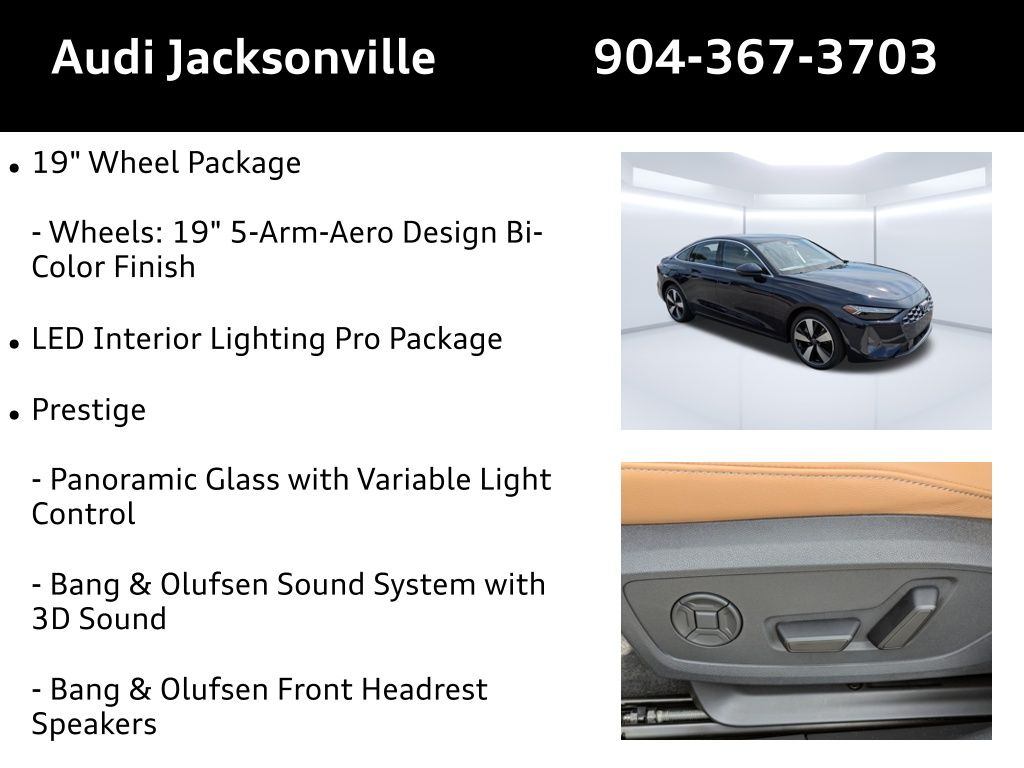 Firmament Blue Metallic 2025 Audi All-new A5 quattro Prestige 7-Speed Automatic S tronic 2.0L 4-Cylinder TFSI 19 Wheel Package, 7 Additional Digital DRL Signatures, ABS brakes, Acoustic Front Door Glass, Adaptive Cruise Assist, Alloy wheels, Animation for Headlights, Animation for Taillights, Audi Beam-Rings, Audi Guard All-Weather Mats, Audi Guard Cargo Mat, Bang & Olufsen Front Headrest Speakers, Bang & Olufsen Sound System w/3D Sound, Compass, Digital OLED Taillights, Dynamic Interaction Light, Electronic Stability Control, Front Bucket Seats, Front Center Armrest, Front dual zone A/C, Head-Up Display, Headlight Washers, Heated & Ventilated Front Sport Seats, Heated door mirrors, Heated Front Bucket Seats, Heated front seats, Heated Rear Seats, Heated Steering Wheel w/Hands-On Detection, Illuminated entry, LED Headlights Plus w/Digital DRL, LED Interior Lighting Pro Package, Low tire pressure warning, Manual Rear Side Window Sunshades, Matrix Design LED Headlights, MMI Passenger Display w/10.9 Screen, Panoramic Glass Roof w/Variable Light Control, Park Assist Plus, Power Liftgate, Power passenger seat, Prestige, Remote keyless entry, Split folding rear seat, Top View Camera System, Traction control, USB Power Delivery (2x60W Front & 2x100W Rear), Wheels: 19 5-Arm-Aero Design Bi-Color Finish.Recent Arrival! 22/31 City/Highway MPG