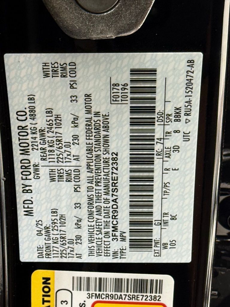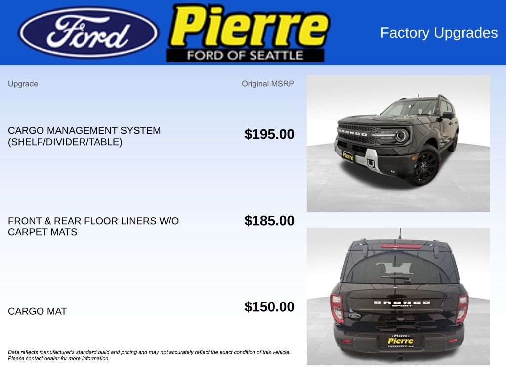 **Ford Courtesy Transportation Vehicle**Equipment Group 400A, 17 Matte Black Painted Aluminum Wheels, Floor Liners Front and Rear without Carpet Mats, Cargo Mat, Cargo Management System, Functional, Ford Co-Pilot360 Assist 2.0, FordPass Connect, Paddle Shifters, Remote Keyless Entry, Remote Start System, SiriusXM - Service Not Available in AK & HI, SYNC4 with EVR & 13.2 Screen, Terrain Management System-7, Trail Control with One-Pedal Drive, Twin Clutch Rear Drive Unit, Zipper Pockets with MOLLE Straps.Pierre Ford of Seattle we service not only the Seattle area Ford customer needs, but also the entire state of Washington and beyond. Our customers come from Seattle, Bremerton, Bellevue, Everett, Wenatchee, Arlington, Burlington, Marysville, Lynnwood, Tacoma, and more. EcoBoost 2.0L I4 GTDi DOHC Turbocharged VCT 8-Speed Automatic Shadow All vehicles are one of each. A dealer documentary service fee of up to $200 may be added to the sale price or capitalized cost. All financing is subject to credit approval. Prices exclude tax, title, and license and are valid for Washington residents only. All transactions are negotiable including price, trade allowance, interest rate (of which the dealer may retain a portion), term, and documentary service fee. Any agreement is subject to execution of contract documents. Every reasonable effort is made to ensure the accuracy of this data. Please verify any information in question with a dealership sales representative. Expires (date) **FACTORY REBATE(S) Purchaser may not qualify for all rebates. Please contact sales department for details. Price includes: $2000 - Retail Customer Cash. Exp. 03/31/2026