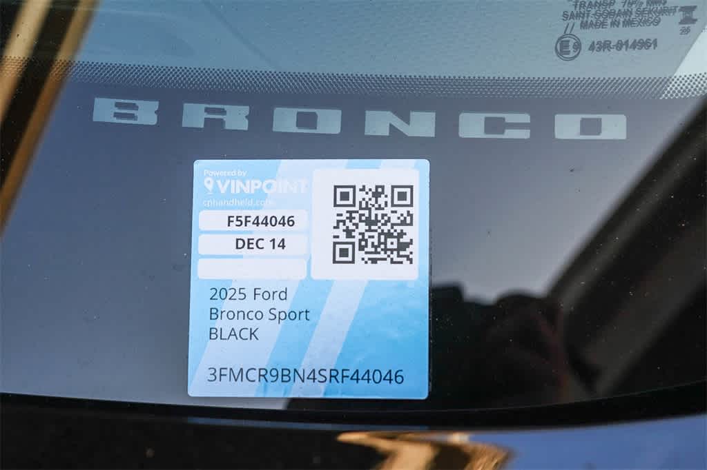 Shadow Black 2025 Ford Bronco Sport Big Bend 4WD 8-Speed Automatic 1.5L EcoBoost 4-Wheel Disc Brakes, 6 Speakers, ABS brakes, Air Conditioning, Alloy wheels, AM/FM radio: SiriusXM, AM/FM Stereo, Auto High-beam Headlights, Automatic temperature control, Brake assist, Cloth w/Easy-to-Clean Front Bucket Seats, Compass, Delay-off headlights, Driver door bin, Driver vanity mirror, Dual front impact airbags, Dual front side impact airbags, Electronic Stability Control, Emergency communication system: SYNC 4 911 Assist, Equipment Group 200A, Four wheel independent suspension, Front anti-roll bar, Front Bucket Seats, Front Center Armrest, Front License Plate Bracket, Front reading lights, Fully automatic headlights, Heated door mirrors, Illuminated entry, Knee airbag, Low tire pressure warning, Occupant sensing airbag, Outside temperature display, Overhead airbag, Overhead console, Panic alarm, Passenger door bin, Passenger vanity mirror, Power door mirrors, Power steering, Power windows, Radio data system, Rear anti-roll bar, Rear Parking Sensors, Rear reading lights, Rear seat center armrest, Rear window defroster, Rear window wiper, Remote keyless entry, Security system, SiriusXM, Speed control, Speed-sensing steering, Speed-Sensitive Wipers, Split folding rear seat, Steering wheel mounted audio controls, SYNC 4 w/Enhanced Voice Recognition, Tachometer, Telescoping steering wheel, Tilt steering wheel, Traction control, Trip computer, Variably intermittent wipers, Wheels: 17 Carbonized Gray-Painted Aluminum.<br><br>25/30 City/Highway MPG Price includes: $1000 - Bonus Customer Cash. Exp. 03/31/2026 $1000 - SUV Spike Retail Bonus Cash. Exp. 02/16/2026 $2000 - Retail Customer Cash. Exp. 03/31/2026