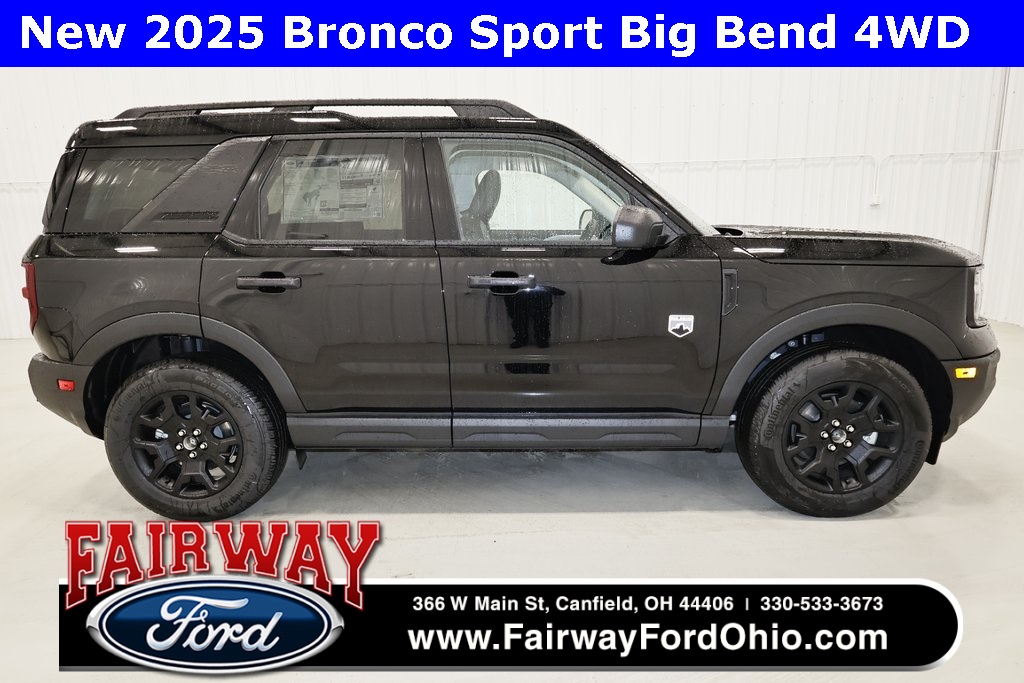 Fairway Ford Sells, Ships, And Collects Taxes In All 50 States***2025 Ford Bronco Sport Big Bend 4D Sport Utility 4WD 1.5L EcoBoost***Power Moonroof***Heated Premium Trimmed Front Sport Contour Bucket Seats***8-Way Power Driver's Seat***Black Appearance Package***17 Matte Black-Painted Aluminum Wheels***All Season Tires***Matte Black Hood Graphic***Carbon Black Grille w/Black BRONCO Lettering***Liftgate w/Black BRONCO SPORT Lettering***Painted Shadow Black Roof***Terrain Management System with 5 G.O.A.T. Modes (Normal, ECO, Sport, Slippery & Off-Road)***Hill Start Assist***HOSS 1.0 Off-Road Tuned Suspension***Front & Rear Stabilizer Bar***Roll Stability Control***Electronic Traction Control***Ford Co-Pilot360 Assist+***Adaptive Cruise Control w/Stop-&-Go, Lane Centering***BLIS (Blind Spot Information System) w/Cross-Traffic Alert***Evasive Steering Assist***Lane-Keeping System (includes Lane-Keeping Assist, Lane Keeping Alert & Driver Alert)***Pre-Collision 1.5 Assist w/Automatic Emergency Braking***Pedestrian Detection, Forward Collision Warning & Dynamic Brake Support***Rear Cross Traffic Braking***Convenience Package***Keyless Entry***Push Start**13.2in. LCD Touchscreen Radio with Swipe Capability***Rear View Camera***Rear Parking Sensors***FordPass Connect***Remotely Start, Lock & Unlock Vehicle***Schedule Specific Times to Remotely Start Vehicle***Locate Parked Vehicle***Check Vehicle Status***SYNC 4***Cloud Connected***911 Assist***Wireless Apple CarPlay & Android Auto Compatibility ***Digital Owner's Manual***Conversational Voice Command Recognition***Wireless Cell Phone Charging Pad***AM/FM/Satellite Radio***Speed-Compensated Volume***Dual Smart Charging USB Ports***12.3in. Instrument Panel***Rotary Gear Shift Dial***Electric Parking Brake***Auto Hold***Air Conditioning***Electronic Automatic Temperature Control***Tilt & Telescope Steering Column***Steering Wheel Mounted Cruise Controls & Audio Controls***Bluetooth Connectivity***Cabin Particulate Air Filter***Split Folding Rear Seats***Molle Straps System***Safety Canopy System Front & Second Row Safety Canopy Side-Curtain with Rollover Sensor***Illuminated Entry System w/ Courtesy Lamp Delay***Rear Cargo Area Light***Powerpoints (12V) One (1) Center Console, One (1) Rear Cargo Area***Cargo Mat***Front & Rear Floor Liners w/o Carpet Mats***Rear Privacy Glass***Manual Liftgate with Flip up Glas***Lighting Flood Light Adjustable Liftgate***Center High-Mounted Stop Lamp***Roof-Rack Side Rails-Black***LED Taillamps***LED Headlamps***Auto High Beam Headlamps***Supplemental PTC Heater***Intelligent Oil-Life Monitor***Battery Saver***Acoustic-Laminated Windshield***Active Grille Shutters***Perimeter Alarm***Personal Safety System***SecuriLock Passive Anti-Theft System***SOS Post-Crash Alert System***Easy Fuel Capless Fuel Filler***Equipment Group 200A***Great Pricing, Selection, & Incentives On All New Bronco Sports At Fairway!!!There truly is a difference when buying a New Vehicle at Fairway Ford. You are able to work with one person from start to finish as there is no need for back and forth negotiations.At Fairway Ford you will experience the most hassle free New Vehicle buying experience around. We have over 300 New Vehicles in stock. Come experience the Fairway buying experience. Fairway That's The Way We Do Business. Price includes: $1000 - Bonus Customer Cash. Exp. 03/02/2026
