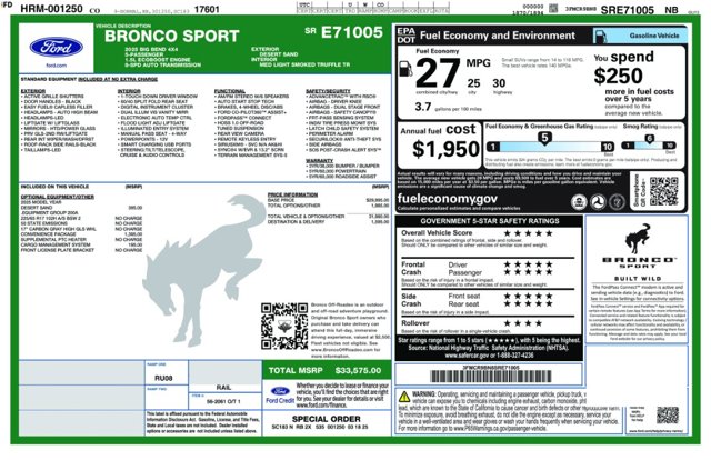 Introducing the Ford Bronco Sport Big Bend 4X4 in a stylish Desert Sand color. At Schomp Ford, we are pleased to offer this gently used loaner vehicle that combines the benefits of a well-maintained car with exceptional value.This Ford Bronco Sport has been meticulously cared for and driven only by our service customers, ensuring it is in top condition and ready for its next owner. The vehicle boasts a modern design and comes equipped with advanced features to enhance your driving experience.Under the hood, you'll find a fuel-efficient 1.5L 3-cylinder engine manufactured by Ford, known as the DRAGON engine. This engine configuration provides a perfect balance of power and efficiency for your everyday driving needs. The Bronco Sport is equipped with a 4WD system, ensuring optimal traction and performance in various road conditions.Inside, the Bronco Sport offers a spacious and comfortable interior with seating for the driver and passenger in the 1st row. Safety features such as standard airbags located in the front and side columns, as well as driver knee airbag, ensure peace of mind for all occupants. The vehicle also includes standard safety technologies such as Electronic Stability Control (ESC), Forward Collision Warning, Lane Departure Warning, and Park Assist.Additionally, the Bronco Sport Big Bend features modern convenience elements like Keyless Ignition, LED Lower Beam Headlamps, a Direct Tire Pressure Monitoring System (TPMS), and standard Daytime Running Lights. The vehicle is designed to offer a smooth and responsive driving experience, with features like ABS standard, Traction Control, and Dynamic Brake Support.With a low odometer reading of 2516 miles, this nearly new Ford Bronco Sport is an excellent choice for drivers looking for a quality vehicle at a great price. At Schomp Ford, we guarantee a transparent and hassle-free purchase experience with our One Price. One Person. One Hour. sales process.Don't miss out on the opportunity to own this well-kept loaner vehicle from Schomp Ford. Explore our inventory today and drive home in style with the Ford Bronco Sport Big Bend 4X4.