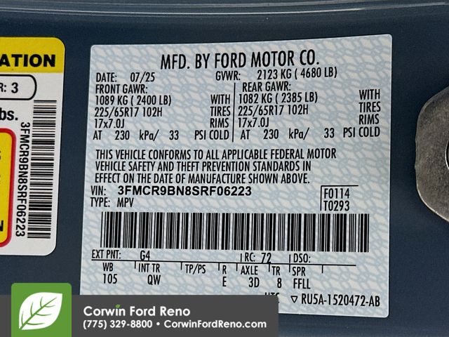 Great Deals are happening now at Corwin Ford Reno. Family owned for over 100 years! Corwin Ford Reno is proud to offer this. 2025 Ford Bronco Sport Priced below KBB Fair Purchase Price! Factory MSRP: $37,500 $6,549 off MSRP!Big Bend 1.5L EcoBoost 4WD Azure Gray Metallic Tri-Coat 25/30 City/Highway MPGSee us today at Corwin Ford Reno or call us at (775) 329-8800. Family owned for over 100 years! Excellent selection of New and Used vehicles, Financing options. Serving Reno, Carson City, Sparks, the North Valleys, Spanish Springs, Verdi, Virginia City, the Carson Valley, and Northern Nevada. *All Prices plus applicable sales tax, and a license, and documentary service fee of $627.75 will be added to sales price or capitalized cost of the vehicle. One vehicle unless otherwise noted and subject to prior sale without notice. While supplies last. EPA mileage estimates are for newly manufactured vehicles only. Your actual mileage will vary depending on how you drive and maintain your vehicle. Rebates included: $1000 - Bonus Customer Cash. Exp. 01/05/2026 $1000 - Final Days Mega Bonus Cash. Exp. 01/02/2026 $500 - Retail Bonus Cash. Exp. 01/05/2026 $500 - Retail Bonus Cash. Exp. 01/05/2026