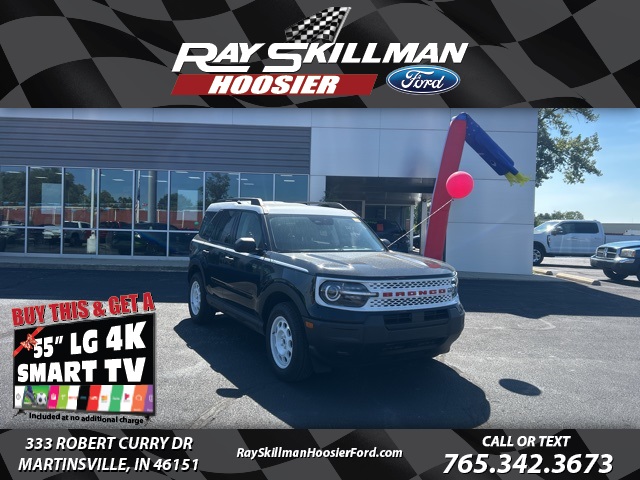 Shadow Black 2025 Ford Bronco Sport Heritage 4WD 8-Speed Automatic 1.5L EcoBoostWhy Buy From Us: At Ray Skillman Hoosier Ford, we are 110% committed to our customers in Martinsville, Bloomington, Mooresville, and all over the great state of Indiana. We want to ease the unnecessary stress of the car buying process and make it simple and enjoyable for you and your family. Our friendly sales team is here to listen to your individual needs and help to identify the right car for you. With so many New Ford Vehicles and a diverse selection of Pre-Owned Vehicles to choose from, drivers are sure to find exactly what they're looking for at Ray Skillman Hoosier Ford. 25/30 City/Highway MPGCall or text 765-342-3673 to schedule your test drive today! All offers shown do not include tax, title, $251 doc/compliance fee, and $299 theft charge . Price includes: $2000 - Retail Customer Cash. Exp. 03/31/2026 $500 - Retail Trade Assist. Exp. 03/31/2026