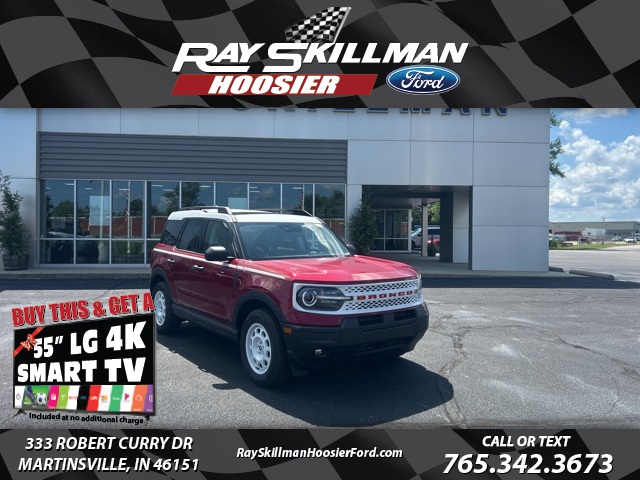 Ruby Red Metallic 2025 Ford Bronco Sport Heritage 4WD 8-Speed Automatic 1.5L EcoBoostWhy Buy From Us: At Ray Skillman Hoosier Ford, we are 110% committed to our customers in Martinsville, Bloomington, Mooresville, and all over the great state of Indiana. We want to ease the unnecessary stress of the car buying process and make it simple and enjoyable for you and your family. Our friendly sales team is here to listen to your individual needs and help to identify the right car for you. With so many New Ford Vehicles and a diverse selection of Pre-Owned Vehicles to choose from, drivers are sure to find exactly what they're looking for at Ray Skillman Hoosier Ford. 25/30 City/Highway MPGCall or text 765-342-3673 to schedule your test drive today! All offers shown do not include tax, title, $251 doc/compliance fee, and $299 theft charge . Price includes: $2000 - Retail Customer Cash. Exp. 03/31/2026 $500 - Retail Trade Assist. Exp. 03/31/2026