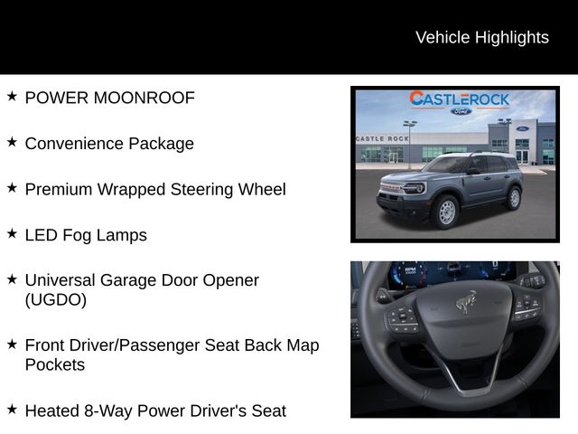 Azure Gray Metallic Tri-Coat 2025 Ford Bronco Sport Heritage 4WD 8-Speed Automatic 1.5L EcoBoost POWER MOONROOF, Convenience Package, Front Driver/Passenger Seat Back Map Pockets, Heated 8-Way Power Driver's Seat, LED Fog Lamps, Premium Wrapped Steering Wheel, Universal Garage Door Opener (UGDO).Recent Arrival! 25/30 City/Highway MPGCastle Rock Ford has been serving the community for decades. Price plus TT&L, fees, $799 dealer doc fee and $399 for LoJack. Call today to schedule a test drive. Price includes: $1000 - Bonus Customer Cash. Exp. 01/05/2026 $500 - Retail Bonus Cash. Exp. 01/05/2026 $500 - Retail Bonus Cash. Exp. 01/05/2026