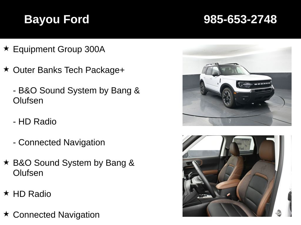 FREE 7-YEAR / 100,000-MILE POWERTRAIN WARRANTY. All New Vehicles receive a Free 7-year / 100,000-mile Powertrain Warranty that covers all major engine and transmission components.Bronco Sport Outer Banks 300A, 4D Sport Utility, 1.5L EcoBoost, 8-Speed Automatic, 4WD, Oxford White, Ebony/Roast w/Premium Trimmed Front Bucket Seats w/Ebony/Roast, B&O Sound System by Bang & Olufsen, Connected Navigation, Equipment Group 300A, HD Radio, Outer Banks Tech Package+, Wheels: 18 Ebony Black-Painted Aluminum.Bayou Automotive is locally owned and operated. We believe in a no-hassle, transparent car buying experience and our main goal is to create an outstanding customer experience! Please feel free to contact the owner, Ben Gaiennie, directly with any questions or concerns about your shopping experience; email owners@bayouautomotive.com.2025 Ford Bronco Sport Outer Banks 300A Oxford White 25/30 City/Highway MPG Price includes: $1000 - Final Days Mega Bonus Cash. Exp. 01/02/2026 $1500 - Retail Bonus Cash. Exp. 01/05/2026