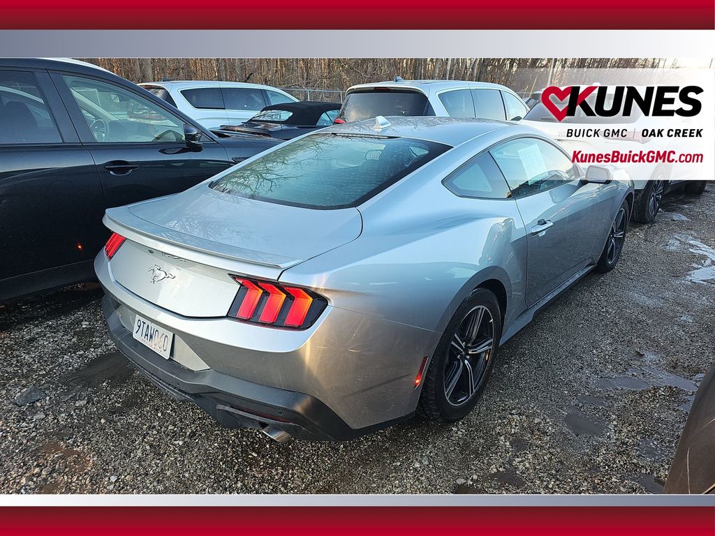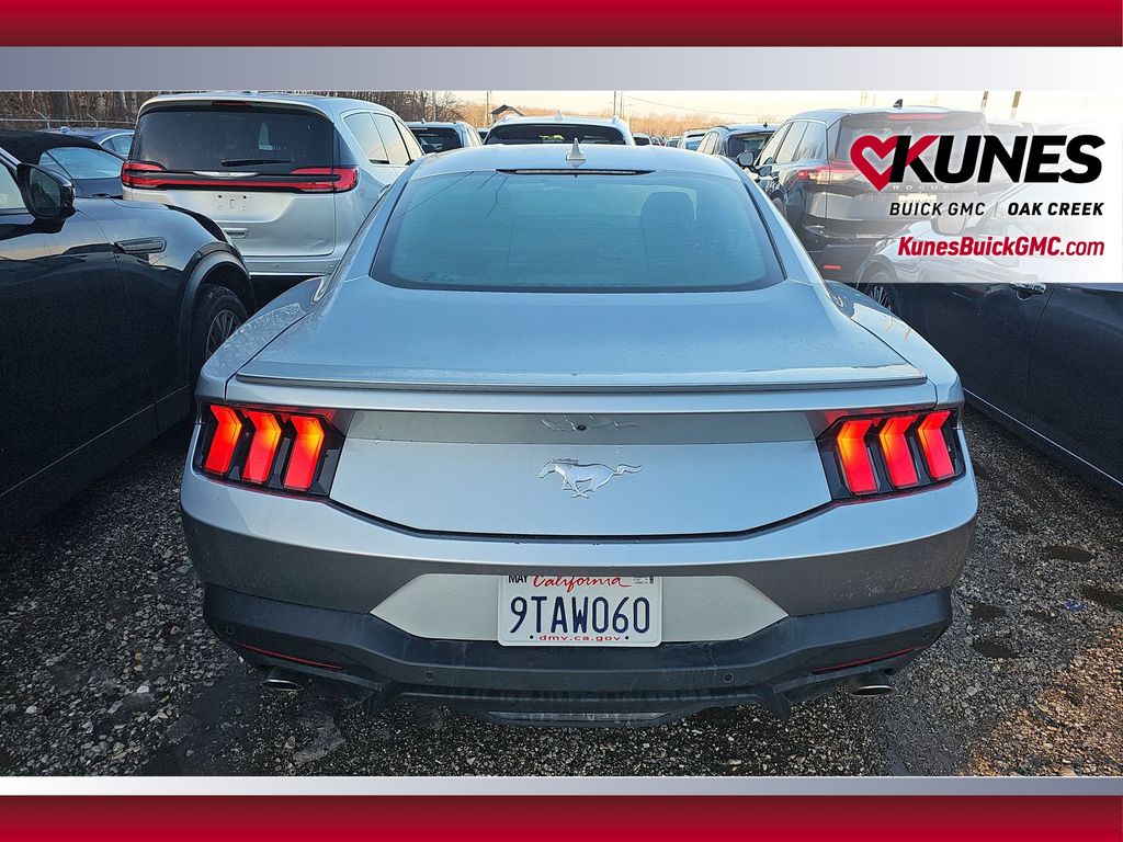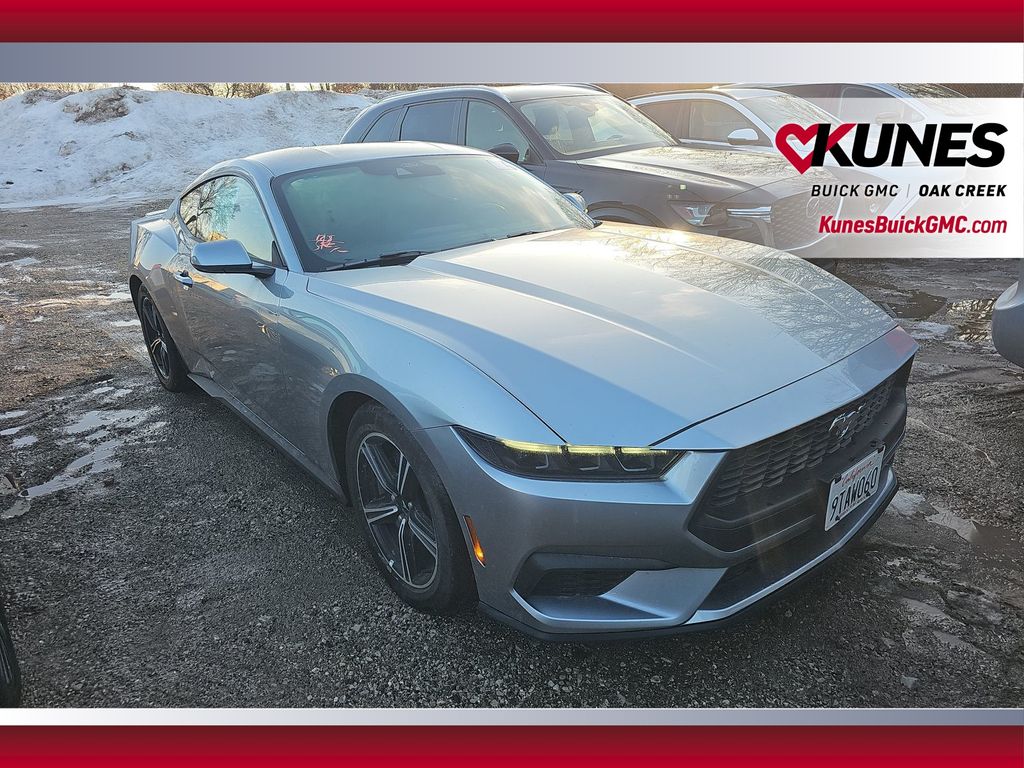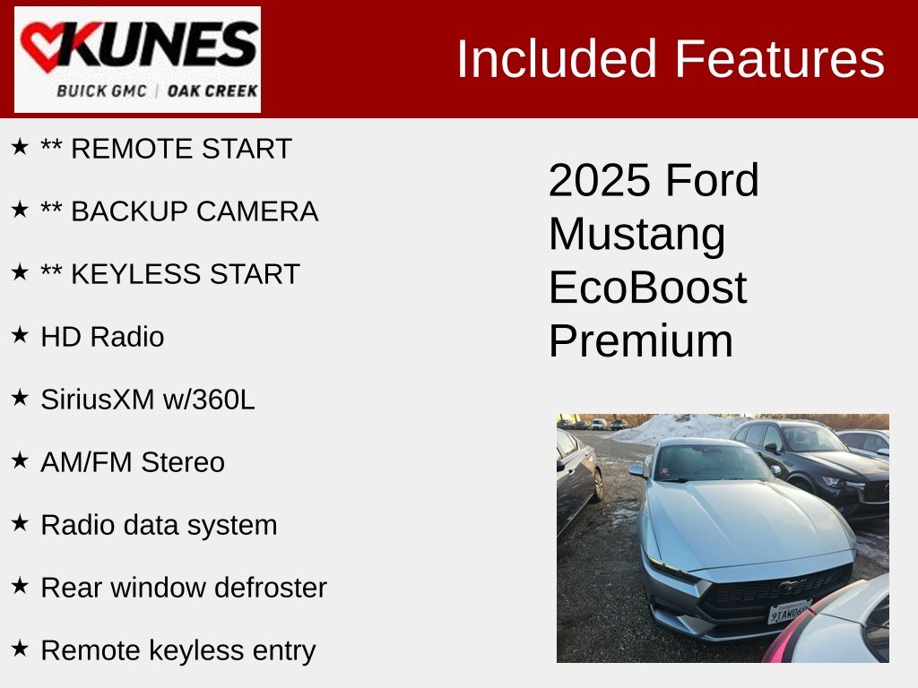 2025 Ford Mustang EcoBoost Premium Silver Metallic RWD EcoBoost 2.3L I4 GTDi DOHC Turbocharged VCTRecent Arrival! 18-inch machined aluminum wheels with all-season tires Limited slip rear axle for enhanced traction Blade-style rear spoiler Remote start system for added convenience LED headlamps and LED signature lighting Rain-sensing windshield wipers Dual-zone automatic climate control Push button start with intelligent access 13.2-inch LCD central touchscreen, 12.4-inch LCD digital gauge cluster Rear parking sensors and backup camera FordPass Connect 4G Wi-Fi hotspot Selectable drive modes including Track Apps Premium Black Onyx ActiveX interior Power-adjustable, heated side mirrors Split folding rear seat Smart charging USB ports (2) AM/FM stereo with SYNC 4 Advanced airbag system and driver knee airbag Tire Pressure Monitoring System SecuriLock anti-theft system 3-year/36,000-mile bumper-to-bumper warranty 5-year/60,000-mile powertrain and roadside assistance