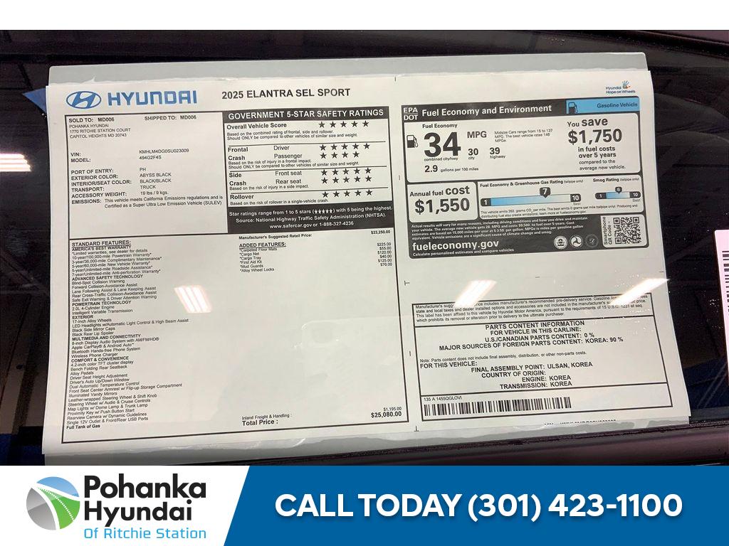 <b>Vehicle Details</b><br>Discover the perfect blend of style' efficiency' and technology with the 2025 Hyundai Elantra SEL Sport. This sleek sedan offers a dynamic driving experience' powered by a responsive 4-cylinder' 2.0L engine coupled with front-wheel drive' ensuring an exhilarating ride with impressive fuel efficiency. Step inside to find a tech-savvy interior designed to enhance your driving experience. Stay connected effortlessly with Hands Free Bluetooth' Android Auto' and Apple CarPlay' allowing seamless integration of your smartphone for navigation' music' and communication. The intuitive Automatic Climate Control ensures your comfort' adapting to your preferred settings with ease. Safety is a priority with the Hyundai Elantra's Back-Up Camera' providing a clear view when reversing and parking' making every journey safer and more convenient. The Hyundai Elantra's modern design' from its striking exterior lines to its comfortable and spacious interior' is perfect for drivers who demand style and substance. Whether you're commuting in the city or embarking on a weekend getaway' the 2025 Hyundai Elantra SEL Sport delivers an enjoyable and confident driving experience. Visit us today to explore this exceptional vehicle and see why the Hyundai Elantra is the smart choice for drivers who value innovation and performance.<br><br><b>Packages</b><br>Option Group 01. Carpeted Floor Mats. Mudguards. Reversible Cargo Tray. Wheel Locks. Cargo Net. First Aid Kit. **Equipment listed is based on original vehicle build and subject to change. Please confirm the accuracy of the included equipment by calling the dealer prior to purchase.**<br><br><b>Additional Information</b><br>Dealer Adjustment reflects either added equipment' a high-demand vehicle selling for above MSRP or both. Ask your dealer for details. We make every effort to provide accurate information but please verify options and price with management before purchasing. All vehicles are subject to prior sale. All prices are special internet prices only. All financing is subject to approved credit. Prices exclude dealer installed options' tax' tags' registration fees and processing fee of $800 (Not required by law). Published price subject to change without notice to correct errors and omissions or in the event of inventory fluctuations. Vehicle offers/prices & internet price quotes valid for 48 hours from initial posting date' subject to change by dealer/manufacturer without notice. All available manufacturer rebates and incentives are included in the internet price. Some manufacturer rebates may not be compatible with special manufacturer finance offers. Manufacturer rebates and incentives are valid during a time period set by the manufacturer and are subject to change without notice. Additional manufacturer rebates and incentives may apply to those who qualify and may lower the sale price. Buyers may not qualify for every incentive and rebate. Dealer installed options are additional. Stock photo colors' options and trim levels may vary. Not responsible for typographical errors. Published price subject to change without notice to correct errors and omissions or in the event of inventory fluctuations. <br><br> For In-Transit Inventory' any date of arrival is estimated. The actual date of delivery may vary due to circumstances beyond Hyundai and the dealers control. Please contact dealer for availability details.<br><br> Vehicle photos may not match exact vehicle. Please call to confirm availability status. <br><br> NHTSA Government 5-Star Safety Ratings are part of the U.S. Department of Transportation's New Car Assessment Program (www.safercar.gov). Model tested with standard side airbags (SAB). <br><br> **Based on model year EPA mileage ratings. Use for comparison purposes only. Your mileage will vary depending on driving conditions' how you drive and maintain your vehicle' battery pack age/condition' and other factors.