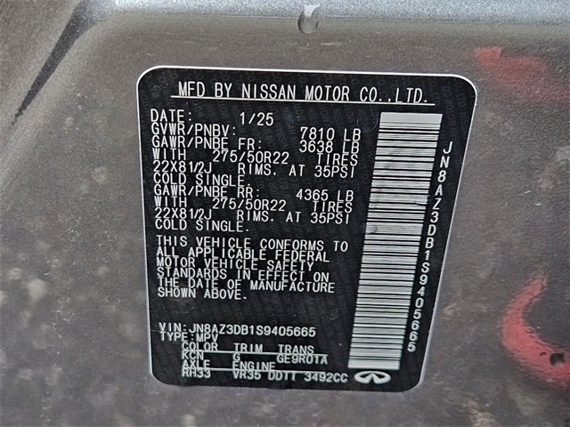 Dealer Discount of $15,000 off MSRP Gray 2025 INFINITI QX80 SENSORY 4WD 9-Speed Automatic 3.5L V6 DOHC 24VApple CarPlay/Android Auto, Auto High-beam Headlights, Heads-Up Display, Heated front seats, Heated rear seats, Memory seat, Navigation system: Google Built-in, Power Liftgate, Power moonroof, Radio: Klipsch Reference Premiere Audio System, Rain sensing wipers, Ventilated front seats, Ventilated rear seats, Wheels: 22 x 8 Cast Aluminum Alloy.Check out this gorgeous 2025 INFINITI QX80 with the following amenities Apple CarPlay/Android Auto, Auto High-beam Headlights, Heads-Up Display, Heated front seats, Heated rear seats, Memory seat, Navigation system: Google Built-in, Power Liftgate, Power moonroof, Radio: Klipsch Reference Premiere Audio System, Rain sensing wipers, Ventilated front seats, Ventilated rear seats, Wheels: 22 x 8 Cast Aluminum Alloy, 3rd row seats: bench, 4-Wheel Disc Brakes, ABS brakes, Adaptive suspension, Air Conditioning, Alloy wheels, AM/FM radio: SiriusXM with 360L, Anti-whiplash front head restraints, Audio memory, Auto tilt-away steering wheel, Auto-dimming door mirrors, Auto-dimming Rear-View mirror, Auto-leveling suspension, Automatic temperature control, Brake assist, Bumpers: body-color, Center Front Spoiler, Climate Controlled Front Bucket Seats w/Massage, Compass, Delay-off headlights, Driver door bin, Driver vanity mirror, Dual front impact airbags, Dual front side impact airbags, Electronic Stability Control, Emergency communication system: INFINITI InTouch, Four wheel independent suspension, Front anti-roll bar, Front Bucket Seats, Front Center Armrest, Front dual zone A/C, Front reading lights, Fully automatic headlights, Garage door transmitter: myQ Connected Garage, Genuine wood dashboard insert, Genuine wood door panel insert, Heated door mirrors, Heated steering wheel, HVAC memory, Illuminated entry, Knee airbag, Leather steering wheel, Literature Kit, Low tire pressure warning, Occupant sensing airbag, Outside temperature display, Overhead airbag, Overhead console, Panic alarm, Passenger door bin, Passenger vanity mirror, Power door mirrors, Power driver seat, Power passenger seat, Power steering, Power windows, Premium Paint, Radio data system, Rear air conditioning, Rear anti-roll bar, Rear reading lights, Rear seat center armrest, Rear window defroster, Rear window wiper, Reclining 3rd row seat, Remote keyless entry, Security system, Semi-Aniline Premium Leather Seating Surfaces, Speed control, Speed-sensing steering, Split folding rear seat, Spoiler, Steering wheel memory, Steering wheel mounted audio controls, Tachometer, Telescoping steering wheel, Tilt steering wheel, Traction control, Trip computer, Turn signal indicator mirrors, and Variably intermittent wipers.