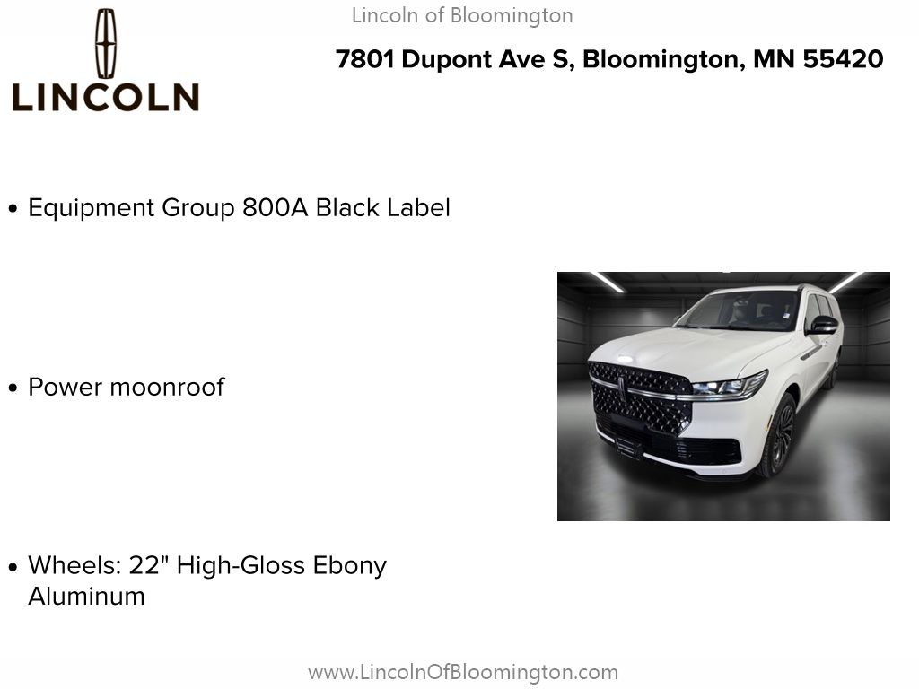 $2,000 off MSRP!White 2025 Lincoln Navigator L Black Label 4WD 3.5L V6Equipment Group 800A Black Label, Power moonroof, Wheels: 22 High-Gloss Ebony Aluminum.Lincoln of Bloomington is driven by values and we make purchasing a new Lincoln easy. Not only will we treat you like family, but we will always deliver the best vehicle buying experience in the Twin Cities. Price includes: $2000 - Wishlist Bonus Cash. Exp. 01/02/2026