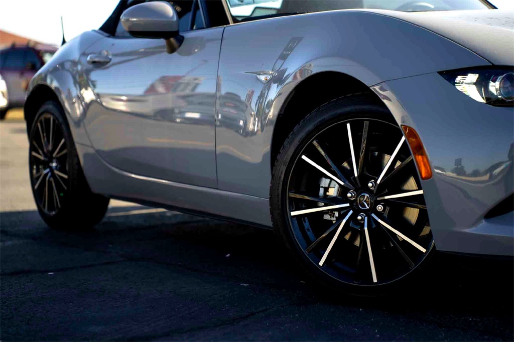 Aero Gray Metallic 2025 Mazda MX-5 Miata Grand Touring RWD 6-Speed Manual 2.0L 4-Cylinder DOHC 16V Weather package, 17 x 7 aluminum alloy wheels with black metallic finish, 4-Wheel Disc Brakes, 9 Speakers, ABS brakes, aero gray metallic paint charge, Air Conditioning, Alloy wheels, AM/FM radio: SiriusXM, AppLink/Apple CarPlay and Android Auto, Auto High-beam Headlights, Auto-dimming door mirrors, Auto-dimming Rear-View mirror, Automatic temperature control, bose audio system with audiopilot, Brake assist, Bumpers: body-color, cargo net, Convertible roof lining, Convertible roof wind blocker, Delay-off headlights, Driver vanity mirror, Dual front impact airbags, Dual front side impact airbags, Electronic Stability Control, Emergency communication system: MAZDA CONNECT, Exterior Parking Camera Rear, Four wheel independent suspension, Front anti-roll bar, Front Bucket Seats, Front Center Armrest, Fully automatic headlights, Garage door transmitter: HomeLink, Glass rear window, Heated door mirrors, heated front bucket seats, Heated front seats, Illuminated entry, Leather Shift Knob, leather upholstery, Low tire pressure warning, MAZDA CONNECT Infotainment system, Navigation System, Occupant sensing airbag, Outside temperature display, Panic alarm, Passenger vanity mirror, Power door mirrors, Power steering, Power windows, Radio data system, Rain sensing wipers, Rear anti-roll bar, Rear window defroster, Remote keyless entry, Speed control, Speed-sensing steering, Sport steering wheel, Steering wheel mounted audio controls, Tachometer, Telescoping steering wheel, Tilt steering wheel, Traction control, Trip computer, Variably intermittent wipers, and wheel locks.