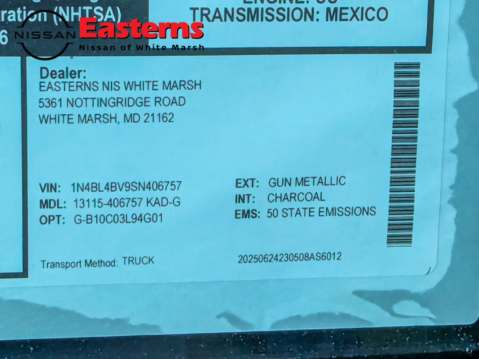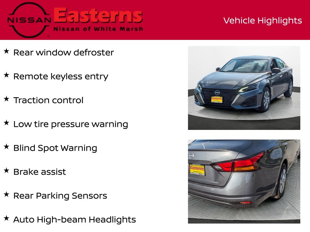 Factory MSRP: $28,775 $3,040 off MSRP! Gun Metallic 2025 Nissan Altima 2.5 S FWD CVT with Xtronic 2.5L 4-Cylinder DOHC 16V CVT with Xtronic, Auto High-beam Headlights, Blind Spot Warning, Body-Colored Splash Guards, Brake assist, Floor Mats/Trunk Mat/Hideaway Net, Low tire pressure warning, NissanConnect featuring Apple CarPlay and Android Auto, Power door mirrors, Rear Parking Sensors, Rear window defroster, Remote keyless entry, Speed control, Split folding rear seat, Traction control.Discover Easterns Nissan of White Marsh. Our dedication to surpassing any price, rate, service offer, and every trade is reserved for new Nissan inventory and valid offers from approved Nissan dealers. Elevate your expectations our commitment to excellence defines the Nissan experience!Easterns Nissan of White Marsh, powered by Easterns Automotive Group, operates with an 'open inventory' system, allowing for seamless transfer and purchase of any car from our ten convenient dealerships across Washington DC, Maryland, and Virginia. With over 1000 cars in our inventory, Visit us in Sterling, VA | Alexandria, VA | Temple Hills, MD | Frederick, MD | Hyattsville, MD | Laurel, MD | Glen Burnie, MD | Baltimore, MD | White Marsh, MD| West Baltimore, MD.