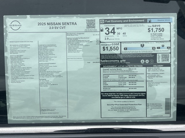 2025 Nissan Sentra SV ALL WEATHER PACKAGE 4D Sedan Gun Metallic30/40 City/Highway MPGYounger Nissan VIP Program Includes 2 Free Oil Changes with Each Used and New Car Purchase. Not all qualify. See dealer for details.Here @ Younger Nissan, we are excited to announce an all-new program called for all 2025 Nissan, it is called Nissan Maintenance Care. What is it you may ask, well simply put it is Maintenance coverage for 2 years or 24k miles. It includes 3 oil changes, right here @ Younger Nissan, using Genuine Nissan Parts by Factory Trained Technicians! DealerRater of the Year 12 years running! 2013-2024. Only Nissan Dealership in Mid-Atlantic Region to achieve his feat. Check out our reviews online on DealerRater.com!Thank you for visiting Younger Nissan of Fredericks web site! Were a Nissan dealer near Germantown, Rockville, and Hagerstown, MD where you can get the best selection of vehicles, and Nissan service. Our goal is to give you access to our full inventory of new Nissans, our used car selection, and our on-site service and collision centers. Through this website, you can get a quote, apply for financing, or schedule an appointment at our service center. No matter the reason you end up coming to us, we promise that youll be given the best customer service by all of our employees. Were a Nissan dealer in Frederick, MD located at 7418 Grove Road. Pay us a visit or give us a call at (877) 522-9872 today!PLEASE MAKE SURE to confirm the details of this vehicle (such as what factory rebates you may or may not qualify for and selling price) with the dealer to ensure its accuracy. Vehicle offers/prices & internet price quotes valid for 24 hours from initial posting date, subject to change by dealer/manufacturer without notice. Vehicle photos may not match exact vehicle. Please call to confirm availability status. Dealer cannot be held liable for data that is listed incorrectly. Dealer prices exclude TAXES, FREIGHT, TITLE, LICENSE, and DEALER PROCESSING FEE of $799.00. Price includes: $500 - Nissan MY25 Sentra Bonus Cash. Exp. 01/05/2026 $500 - Nissan NER MY25 Sentra (SV - SR) Customer Cash (WDC) - December. Exp. 01/05/2026