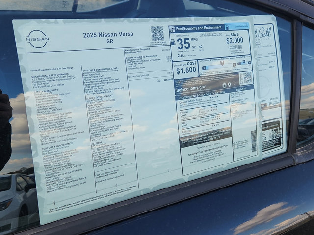 2025 Nissan Versa Super Black Metallic 1.6 SRTrunk Package (Shopping Bag Hooks and Trunk Net), 17 Aluminum Alloy Wheels, 6 Speakers, ABS brakes, Air Conditioning, Alloy wheels, AM/FM radio: SiriusXM, Apple CarPlay/Android Auto, Auto High-beam Headlights, Automatic temperature control, Blind Spot Warning, Brake assist, Bumpers: body-color, Carpeted Floor Mats & Trunk Mat (5-Piece Set), Delay-off headlights, Driver door bin, Driver vanity mirror, Dual front impact airbags, Dual front side impact airbags, Electronic Stability Control, Emergency communication system, Front anti-roll bar, Front Bucket Seats, Front Center Armrest, Front reading lights, Front wheel independent suspension, Fully automatic headlights, Heated door mirrors, Heated Front Bucket Seats, Heated front seats, Illuminated entry, Knee airbag, Leather steering wheel, Low tire pressure warning, Occupant sensing airbag, Outside temperature display, Overhead airbag, Panic alarm, Passenger door bin, Passenger vanity mirror, Power door mirrors, Power steering, Power windows, Radio data system, Radio: AM/FM Audio System, Rear Parking Sensors, Rear side impact airbag, Rear window defroster, Remote keyless entry, Speed control, Splash Guards, Split folding rear seat, Spoiler, SR Fabric Seat Trim, Steering wheel mounted audio controls, Tachometer, Telescoping steering wheel, Tilt steering wheel, Traction control, Trip computer, Turn signal indicator mirrors, and Variably intermittent wipers.*BLUETOOTH* *BACKUP CAMERA* 32/40 City/Highway MPG Price includes: $750 - Nissan MY25 Versa Bonus Cash (All Markets) - December. Exp. 01/05/2026