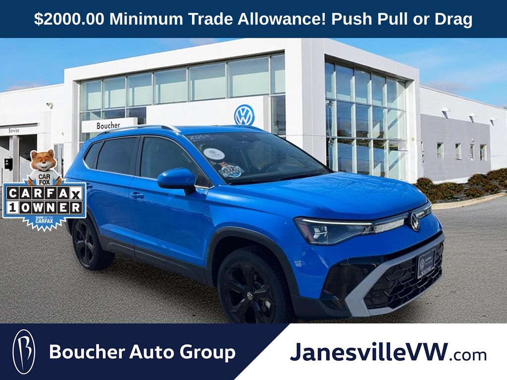 2025 Volkswagen Taos 1.5T SELCARFAX One-Owner. Clean CARFAX. *VW Certified Pre-Owned!*, *Includes Remaining Factory Warranty!*, Auto-dimming Rear-View mirror, Black Wheel Plus Package, Compass, Emergency communication system: VW Car-Net Safe & Secure 5-year, Exterior Parking Camera Rear, Front dual zone A/C, Fully automatic headlights, Heated front seats, Heated steering wheel, Illuminated entry, Navigation system: VW Car-Net Guide & Inform, Perforated Vienna Leather Seating Surfaces, Power driver seat, Power moonroof, Radio: MIB3 Discover Media AM/FM/HD, Remote keyless entry, Ventilated front seats, Wheels: 19 2-Tone Machined Alloy, Wheels: 19 Black Painted Alloy.This vehicle is a 100% Volkswagen Certified vehicle that includes a 120-point VW Certified Inspection, 2-year or 24,000-mile above and beyond any remaining new Volkswagen warranty, as well as 24-hr Roadside assistance, and so much more.Price excludes tax, title, license, service fee.