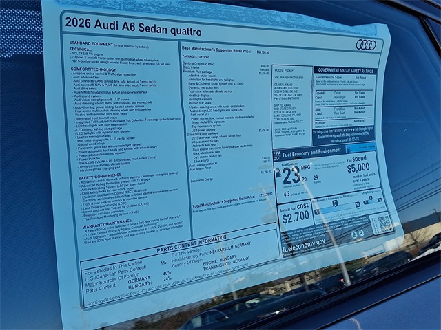 2026 Audi A6 3.0 quattro quattro, Black Leather.$3,776 off MSRP! 20/29 City/Highway MPGWe Are Audi State College, your premier Audi dealer in State College, Pennsylvania, we're proud to offer a stunning selection of the latest Audi models, backed by exceptional customer service and unbeatable deals. Whether you're looking for the dynamic Audi A3, the sleek Audi A4, the luxurious Audi A6, or the performance-driven Audi S5, we have something to meet every need. Explore the sophisticated Audi Q3, the versatile Audi Q5, or the commanding Audi Q7. For those seeking cutting-edge innovation, the Audi Q8 and the all-electric Audi e-tron are ready to impress. Plus, experience the exhilarating power of the Audi RS5, Audi S7, and more. As a proud member of the Ciocca Automotive family, we offer attractive lease options and specials tailored to fit your budget. Whether you're interested in financing or leasing a new Audi, our team is here to help you find the perfect vehicle. Visit us today at Audi State Collegeyour destination for new Audi vehicles in State College. Drive home in your dream Audi today!