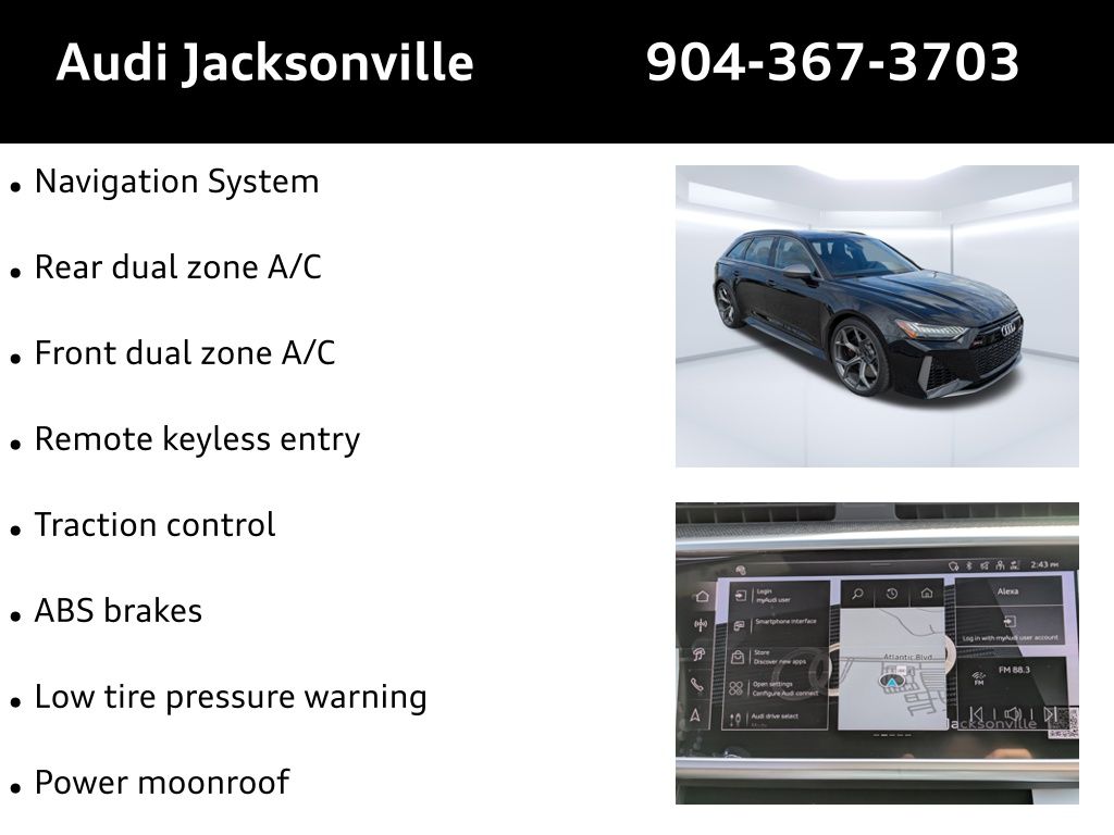 Mythos Black Metallic 2026 Audi RS 6 Avant performance quattro quattro 8-Speed Automatic with Tiptronic 4.0L V8 ABS brakes, Alloy wheels, Compass, Electronic Stability Control, Front dual zone A/C, Heated door mirrors, Heated front seats, Illuminated entry, Low tire pressure warning, Navigation System, Power Liftgate, Power moonroof, Rear dual zone A/C, Remote keyless entry, Traction control.