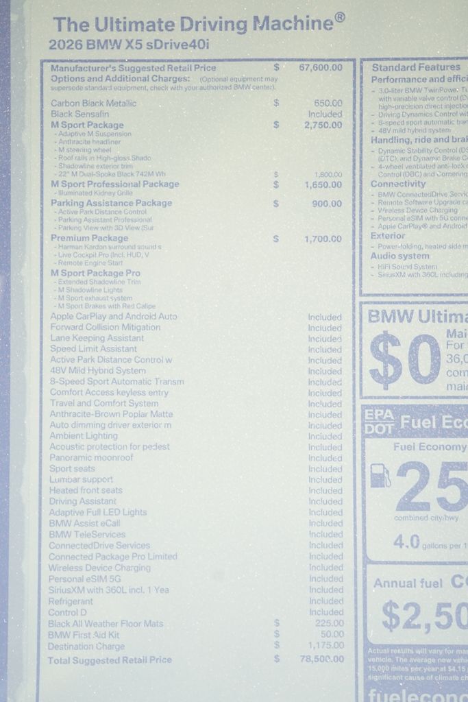 Carbon Black Metallic 2026 BMW X5 sDrive40i RWD 8-Speed Automatic Sport 3.0L I6 DOHC 24V23/27 City/Highway MPG