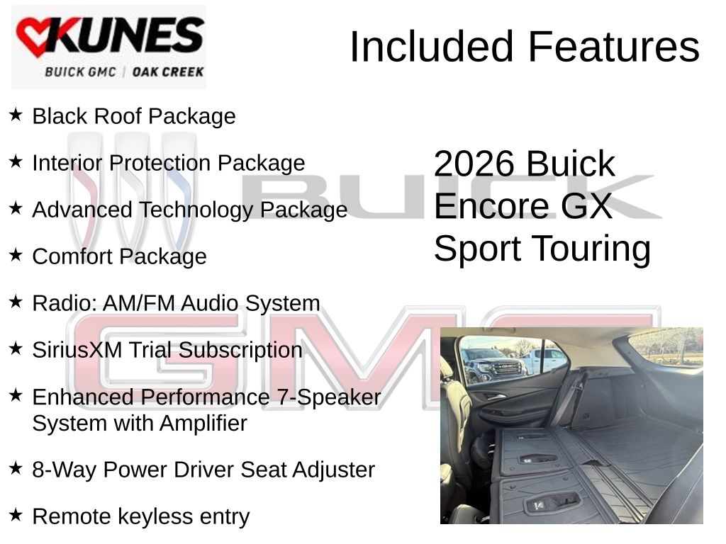 Moonstone Gray Metallic 2026 Buick Encore GX Sport Touring AWD 9-Speed Automatic ECOTEC 1.3L Turbo 2-Way Power Driver Lumbar Control, 8-Way Power Driver Seat Adjuster, Adaptive Cruise Control, Advanced Technology Package, All-Weather Floor Liners, Black Exterior Mirror Caps, Black Roof Package, Black Roof Panel, Black Roof Rails, Cargo Liner, Comfort Package, Enhanced Performance 7-Speaker System with Amplifier, Flat-Folding Front Passenger Seatback, HD Surround Vision, Heated Driver and Front Passenger Seats, Heated Steering Wheel, Interior Protection Package, Leatherette Seat Trim, Radio: AM/FM Audio System, Rear Center Armrest, Rear Park Assist, Remote keyless entry, SiriusXM Trial Subscription, Sport Pedal Kit, Wheels: 18 Gloss Black Aluminum, Wireless Apple CarPlay/Wireless Android Auto, Wireless Charging.26/28 City/Highway MPGAlso included with every new vehicle we sell: LIFETIME NO FEAR WARRANTY, FIRST OIL CHANGE, and AT HOME COURTESY DELIVERY! Call us for full details! We pride ourselves on honesty and integrity, but please note that mistakes or misprints due to human error are possible. Find out why our dealerships have won DealerRater.com DEALER OF THE YEAR a whopping 10 TIMES! Call, email, or live chat with one of our friendly sales professionals now to schedule your test drive! Prices shown do not include tax, title, registration and $599 service fees.