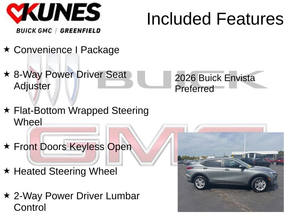 2-Way Power Driver Lumbar Control, 8-Way Power Driver Seat Adjuster, Convenience I Package, Flat-Bottom Wrapped Steering Wheel, Front Doors Keyless Open, Heated Steering Wheel. Moonstone Gray Metallic 2026 Buick Envista Preferred FWD 6-Speed Automatic 28/32 City/Highway MPG ECOTEC 1.2L Turbo28/32 City/Highway MPGAlso included with every new vehicle we sell: LIFETIME NO FEAR WARRANTY, FIRST OIL CHANGE, and AT HOME COURTESY DELIVERY! Call us for full details! We pride ourselves on honesty and integrity, but please note that mistakes or misprints due to human error are possible. Find out why our dealerships have won DealerRater.com DEALER OF THE YEAR a whopping 10 TIMES! Call, email, or live chat with one of our friendly sales professionals now to schedule your test drive! Prices shown do not include tax, title, registration and $599 service fees. Price includes: Price Includes: $250 - Kunes Special Offer or Conditional GM Conquest Purchase Cash. Exp