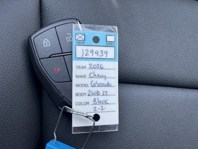 Black 2026 Chevrolet Colorado LT RWD 8-Speed Automatic 2.7L I4 Turbocharged DOHC 16V LEV3-ULEV50 310hpLT Convenience Package (120-Volt Bed-Mounted Power Outlet, 120-Volt Power Outlet, Driver Seatback Map Pocket, Dual Rear USB Ports (charge Only), Evotex Seat Trim, Front LED Fog Lamps, Heated Steering Wheel, LED Daytime Running Lamps, LED Headlamps, LED Stop Tail Lamp, Rear Center Armrest, and Wireless Phone Charging), Preferred Equipment Group 2LT (Automatic Emergency Braking, Chevy Safety Assist, Following Distance Indicator, Forward Collision Alert, Front Pedestrian and Bicyclist Braking, IntelliBeam Automatic High Beam on/Off, and Lane Keep Assist with Lane Departure Warning), Technology Package (Adaptive Cruise Control, HD Surround Vision, and Rear Pedestrian Alert), 3 Years SiriusXM, 3.42 Rear Axle Ratio, 4-Way Manual Passenger Seat Adjuster, 4-Wheel Disc Brakes, 6 Speakers, 6-Speaker Audio System Feature, 8-Way Power Driver Seat Adjuster, ABS brakes, Air Conditioning, Alloy wheels, AM/FM radio: SiriusXM with 360L, Apple CarPlay/Android Auto, Auto High-beam Headlights, Auto-dimming Rear-View mirror, Automatic temperature control, Brake assist, Bumpers: body-color, Cloth Seat Trim, Compass, Delay-off headlights, Driver and Front Passenger Heated Seats, Driver door bin, Driver vanity mirror, Dual front impact airbags, Dual front side impact airbags, Electronic Stability Control, Emergency communication system: OnStar, Front anti-roll bar, Front Bucket Seats, Front Center Armrest, Front dual zone A/C, Front License Plate Kit, Front Passenger Seatback Map Pocket, Front reading lights, Front wheel independent suspension, Heated door mirrors, Heated front seats, Illuminated entry, Low tire pressure warning, Navigation System, Occupant sensing airbag, Outside temperature display, Overhead airbag, Overhead console, Panic alarm, Passenger door bin, Passenger vanity mirror, Power door mirrors, Power Driver Lumbar Control Seat Adjuster, Power driver seat, Power steering, Power windows, Radio data system, Radio: 11.3 Diagonal Advanced Color LCD Display, Rear reading lights, Rear step bumper, Rear window defroster, Remote keyless entry, Security system, SiriusXM with 360L Trial Subscription, Speed control, Speed-sensing steering, Split folding rear seat, Steering Wheel Mounted Audio Controls, Steering wheel mounted audio controls, Tachometer, Telescoping steering wheel, Tilt steering wheel, Traction control, Trip computer, Variably intermittent wipers, Wheels: 17 x 8 Argent Metallic Aluminum, and Wireless Phone Projection.