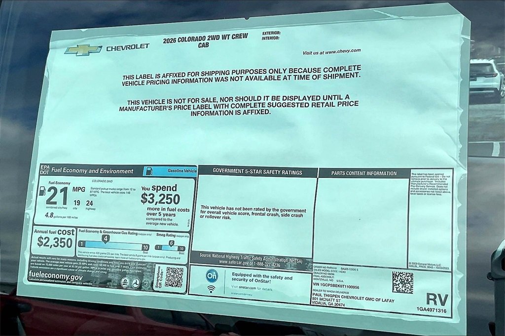Snowdrift Metallic 2026 Chevrolet Colorado Work Truck 2.7L I4 Turbocharged DOHC 16V LEV3-ULEV50 310hp RWD Preferred Equipment Group 2WT (Automatic Emergency Braking, Chevy Safety Assist, Following Distance Indicator, Forward Collision Alert, Front Pedestrian and Bicyclist Braking, IntelliBeam Automatic High Beam on/Off, and Lane Keep Assist with Lane Departure Warning), WT Convenience Package II (4-Spoke Wrapped Steering Wheel, 8-Way Power Driver Seat Adjuster, EZ-Lift and Lower Tailgate, Power Driver Lumbar Control Seat Adjuster, StowFlex Tailgate Storage Compartment, and Tailgate Keyed Cylinder Lock), WT Custom Package (Black Nameplates and Wheels: 18 x 8.5 Black High Gloss Aluminum), 3.42 Rear Axle Ratio, 4-Way Manual Passenger Seat Adjuster, 4-Wheel Disc Brakes, 6 Speakers, 6-Speaker Audio System Feature, 6-Way Manual Driver Seat Adjuster, ABS brakes, Air Conditioning, AM/FM radio: SiriusXM with 360L, Apple CarPlay/Android Auto, Auto High-beam Headlights, Brake assist, Cargo Tie-Down Rings (set of 4), Cloth Seat Trim, Delay-off headlights, Driver door bin, Driver vanity mirror, Dual front impact airbags, Dual front side impact airbags, Electronic Stability Control, Emergency communication system: OnStar, Front anti-roll bar, Front Bucket Seats, Front Center Armrest, Front License Plate Kit, Front wheel independent suspension, Heated door mirrors, Low tire pressure warning, Navigation System, Occupant sensing airbag, Overhead airbag, Panic alarm, Passenger door bin, Passenger vanity mirror, Power door mirrors, Power steering, Power windows, Radio data system, Radio: 11.3 Diagonal Advanced Color LCD Display, Rear step bumper, Rear window defroster, Remote keyless entry, Security system, SiriusXM with 360L Trial Subscription, Speed control, Speed-sensing steering, Split folding rear seat, Steering Wheel Mounted Audio Controls, Steering wheel mounted audio controls, Tachometer, Tilt steering wheel, Traction control, Trip computer, Variably intermittent wipers, Wheels: 17 x 8 Ultra Silver Metallic Steel, and Wireless Phone Projection.* *Discounted price Includes our Paul Thigpen Chevrolet GMC La Fayette TRADE-IN ASSISTANCE discount of $2,000.00* * * *Discounted price Includes our Paul Thigpen Chevrolet GMC La Fayette FINANCE WITH US -N- SAVE discount of $1,250.00* * - All discounts & promo offers are reflected in in discounted pricing (see qualifying details below) - To qualify for Trade-In Assistance - customers must trade-in a 2010 or newer vehicle. Trade must be in working condition with current registration, taxes, inspections(safety or Gov) and misc. Fees. - To qualify for FINANCE WITH US -N- SAVE discount you must qualify for, and finance at least $10,000.00 of purchase balance through a dealer sourced Credit Union, bank, or financial institution. **Consumer must refer to this ad to receive discounted pricing**Employees and their family members are excluded from special pricing discounts** Price includes: $1000 - Customer Cash. Exp. 03/02/2026