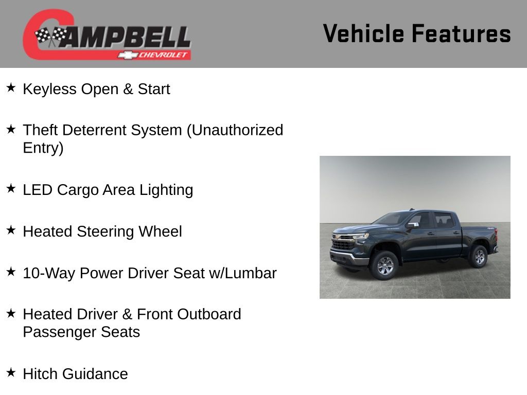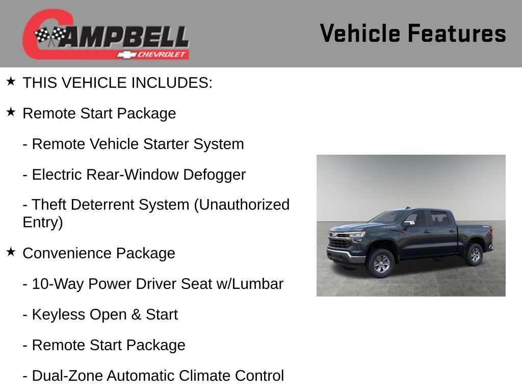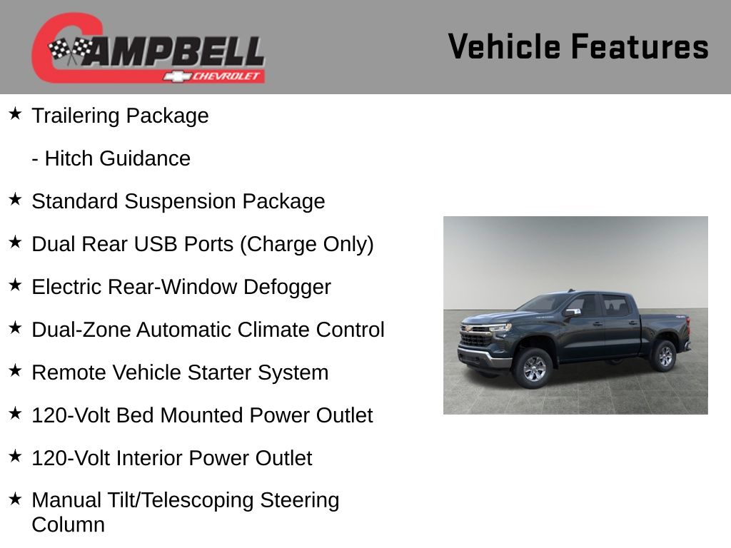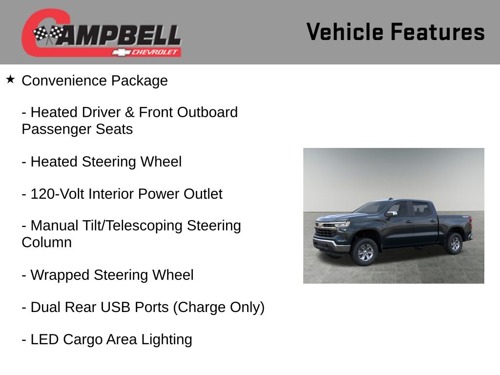 Discover the power and versatility of the 2026 Chevrolet Silverado 1500 LT. This exceptional full-size pickup is built to handle your toughest tasks with ease, while delivering a refined and comfortable driving experience.Boasting a 5.3L EcoTec3 V8 engine, the Silverado 1500 LT delivers an impressive 355 horsepower and 383 lb-ft of torque, seamlessly paired with a 10-speed automatic transmission and 4-wheel drive. This powertrain not only provides ample power, but also optimizes efficiency, with an EPA-estimated 15 MPG in the city and 19 MPG on the highway.Key features of this Silverado 1500 LT include: 5.3L V8 EcoTec3 engine with Dynamic Fuel Management Convenience Package Remote Start Package Standard Suspension Package Trailering Package Dual Rear USB Ports (Charge Only) Dual-Zone Automatic Climate Control Electric Rear-Window Defogger 120-Volt Bed Mounted Power Outlet 120-Volt Interior Power Outlet Remote Vehicle Starter SystemThe Silverado 1500 LT also boasts a host of advanced safety and technology features, including Automatic Emergency Braking, Lane Keep Assist with Lane Departure Warning, and a 12.3 Multicolor Reconfigurable Digital Display. Connectivity is seamless with Apple CarPlay and Android Auto integration.Adorned in a sleek Cypress Gray exterior, this Silverado 1500 LT exudes a commanding presence on the road. The chrome mirror caps and 17 bright silver painted aluminum wheels add a touch of premium style, while the standard tailgate and hitch guidance make towing and hauling a breeze.Whether you're tackling tough jobs or embarking on weekend adventures, the 2026 Chevrolet Silverado 1500 LT is the perfect companion. Experience the perfect blend of power, capability, and refinement. Visit our showroom today to take this impressive truck for a test drive and discover how it can elevate your driving experience. Price includes: $1500 - GM Bonus Cash. Exp. 03/02/2026 $3250 - Chevrolet Consumer Cash Program. Exp. 03/02/2026