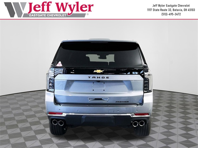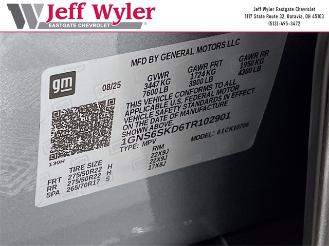 Sterling Gray Metallic 2026 Chevrolet Tahoe Premier EcoTec3 5.3L V8 4WD 10-Speed Automatic with Overdrive 15/19 City/Highway MPG Jeff Wyler Eastgate Auto Mall is very proud to offer this wonderful-looking 2026 Chevrolet Tahoe Premier in Sterling Gray Metallic. Well equipped with: Preferred Equipment Group 1LZ (20 x 9 Polished Aluminum Wheels, 3-Spoke Wrapped Steering Wheel, 3rd Row 60/40 Power-Folding Split-Bench Seat, Auto-Dimming Inside Rear-View Mirror, Chrome Mirror Caps, Color-Keyed Carpeting Floor Covering, Dual Exhaust System, Floor Console, Front Bucket Seats, Front LED Fog Lamps, Heated 2nd Row Outboard Seats, Heated Steering Wheel, Interior Camera, Key Card, LED Tail Lamps, Magnetic Ride Control Suspension, Memory Settings, Outside Heated Power-Adjustable Mirrors, Power Release 2nd Row Bucket Seats, Rear Power Liftgate, Remote Start, Universal Home Remote, and Wireless Phone Charging), 10 Speakers, 3.23 Rear Axle Ratio, 3rd row seats: split-bench, 4-Way Power Driver Lumbar Seat Adjuster, 4-Way Power Front Passenger Lumbar Seat Adjuster, 4-Wheel Disc Brakes, 8-Way Power Driver Seat Adjuster, 8-Way Power Front Passenger Seat Adjuster, ABS brakes, Adaptive suspension, Air Conditioning, Alloy wheels, AM/FM radio: SiriusXM with 360L, Apple CarPlay/Android Auto, Auto High-beam Headlights, Auto-dimming door mirrors, Auto-dimming Rear-View mirror, Auto-leveling suspension, Automatic temperature control, Brake assist, Bumpers: body-color, Compass, Delay-off headlights, Driver door bin, Driver vanity mirror, Dual front impact airbags, Dual front side impact airbags, Electronic Stability Control, Emergency communication system: OnStar and Chevrolet connected services capable, Exterior Parking Camera Rear, Four wheel independent suspension, Front anti-roll bar, Front Center Armrest, Front dual zone A/C, Front fog lights, Front reading lights, Fully automatic headlights, Garage door transmitter, Heated door mirrors, Heated front seats, Heated rear seats, Heated steering wheel, Illuminated entry, Low tire pressure warning, Memory seat, Navigation system: Google built-in compatibility (select service plan required, terms and limitations apply), Occupant sensing airbag, Outside temperature display, Overhead airbag, Overhead console, Panic alarm, Passenger door bin, Passenger vanity mirror, Perforated Leather Seat Trim, Power door mirrors, Power driver seat, Power Liftgate, Power passenger seat, Power steering, Power windows, Premium audio system: Chevrolet Infotainment 3 Premium, Radio data system, Radio: 17.7 Diagonal Advanced Color LCD Display, Rain sensing wipers, Rear air conditioning, Rear anti-roll bar, Rear reading lights, Rear window defroster, Rear window wiper, Remote keyless entry, Security system, Speed control, Speed-sensing steering, Split folding rear seat, Spoiler, Steering wheel memory, Steering wheel mounted audio controls, Tachometer, Telescoping steering wheel, Tilt steering wheel, Traction control, Trip computer, Turn signal indicator mirrors, Variably intermittent wipers, Ventilated front seats, and Voltmeter.