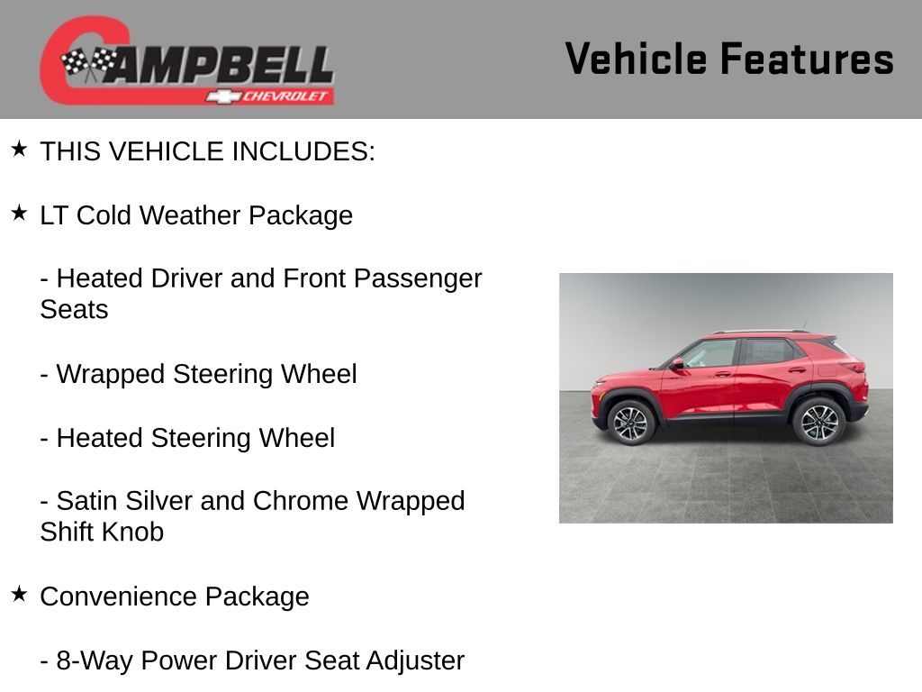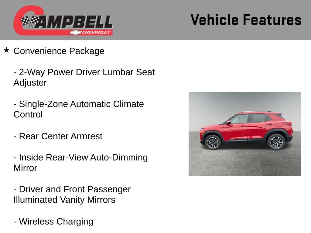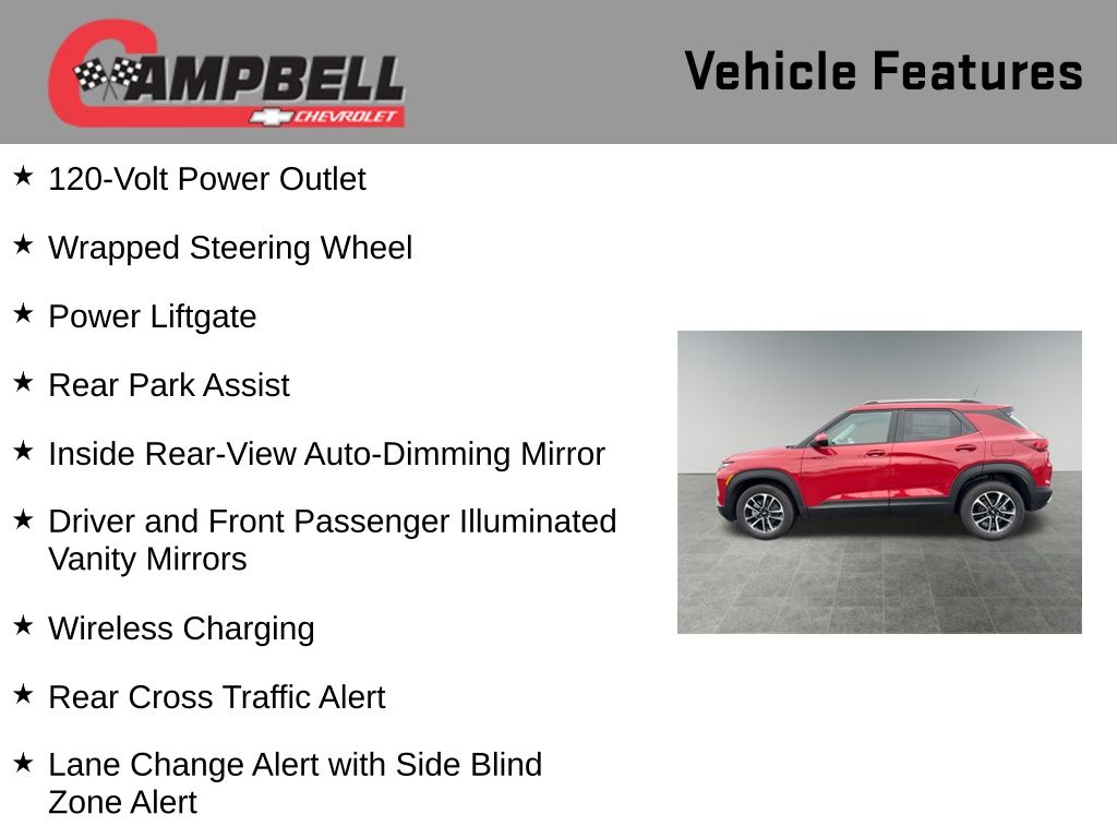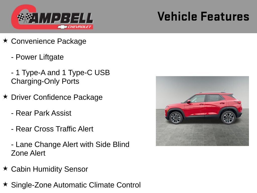 The 2026 Chevrolet TrailBlazer LT is a versatile and well-equipped SUV that offers an exceptional driving experience. With its sleek design, advanced technology, and impressive performance, this vehicle is the perfect choice for those seeking a dynamic and capable ride.Highlights of this TrailBlazer LT include: Convenience Package Driver Confidence Package LT Cold Weather Package Cabin Humidity Sensor Single-Zone Automatic Climate Control 120-Volt Power Outlet 8-Way Power Driver Seat Adjuster Wrapped Steering Wheel Power Liftgate Rear Park AssistUnder the hood, the TrailBlazer LT boasts a 1.3L I3 Turbocharged engine, delivering a thrilling 137 horsepower and an exceptional 174 lb-ft of torque. Paired with a smooth-shifting CVT transmission and front-wheel drive, this powertrain provides a responsive and efficient driving experience, with an impressive EPA-estimated 29 MPG in the city and 33 MPG on the highway.The exterior of the TrailBlazer LT is sure to turn heads, with its bold and distinctive Red color. The sleek lines and sculpted design elements create a modern and dynamic appearance, while the 17-inch High Gloss Black Machined Aluminum wheels add a touch of style and sophistication.Inside, the TrailBlazer LT offers a spacious and well-appointed cabin, with a range of premium features to enhance your driving experience. The Convenience Package includes automatic climate control, wireless charging, and a 120-volt power outlet, while the LT Cold Weather Package adds heated seats and a heated steering wheel for those chilly mornings.The Driver Confidence Package takes safety to the next level, with features like Lane Change Alert with Side Blind Zone Alert, Rear Cross Traffic Alert, and Rear Park Assist, providing you with added peace of mind on the road.Whether you're commuting to work, embarking on a weekend adventure, or transporting the whole family, the 2026 Chevrolet TrailBlazer LT is the perfect companion. With its exceptional performance, advanced technology, and comprehensive suite of features, this SUV is sure to exceed your expectations. We invite you to visit our showroom and experience the power and versatility of the TrailBlazer LT for yourself. Price includes: $500 - GM Financial Standalone Special APR & Down Payment Assistance Program: $500 discount and 15.90% APR for 36 months. $35.11 per $1000 financed. Available to well qualified buyers who finance through GM Financial. XGU. Exp. 03/02/2026