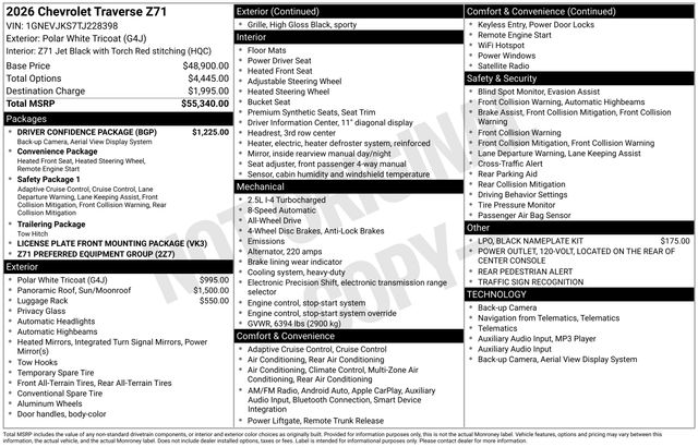Polar White Tricoat 2026 Chevrolet Traverse Z71 AWD 8-Speed Automatic 2.5L DOHC AWD.Recent Arrival!