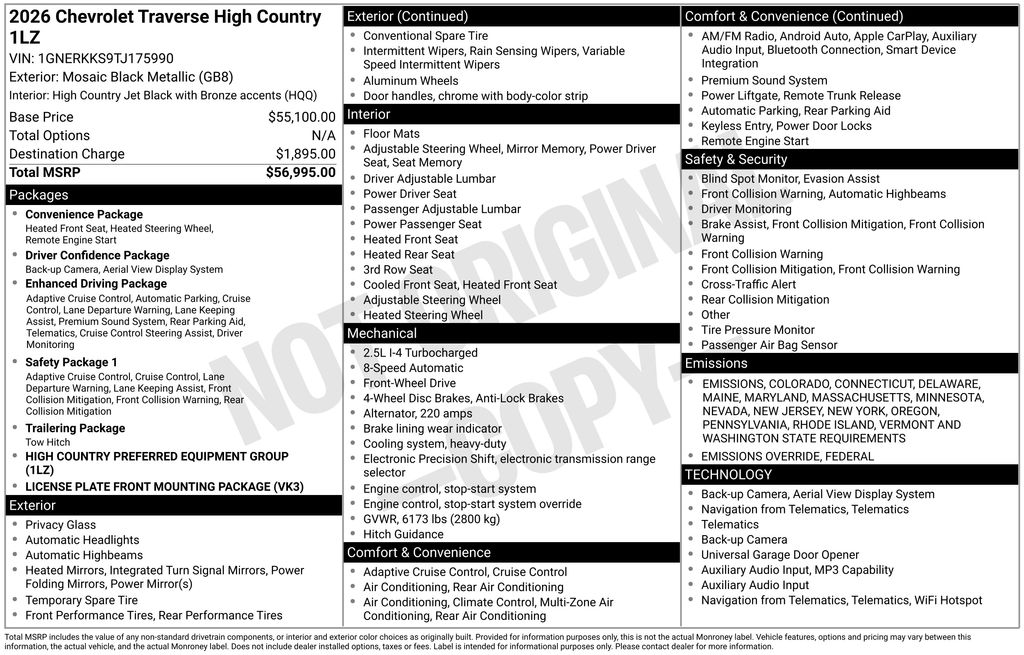 Price includes: $1,100 - Exp. 03/01/2026 RK Conquest/ Loyalty -Trade in any vehicle from a local dealer (Any Hampton Roads NEW automotive dealership) and you will receive at least the amount listed as an increased trade value or added to the discount line. $762 - Exp. 03/02/2026 RK Heart-Stopping Savings -- Available to All $1,523 - Exp. 03/02/2026 RK-RK-New Year. New RK Savings - Available to ALL $3,385 off MSRP! Mosaic Black Metallic 2026 Chevrolet Traverse High Country FWD 8-Speed Automatic 2.5L DOHC*RK Processing Fee* Internet prices do not include $999.00 Processing Fee, DMV Fees or any applicable taxes. New vehicle internet prices also do not include any add on equipment and/or BUYER SELECTED suspension lift, body lift, any truck body (for commercial vehicles), custom wheels, custom tires, custom paint or other similar aftermarket products (either depicted or not depicted on website) on these specialty items, which can be added to a vehicle. While every attempt has been made to ensure the accuracy of the data displayed, the dealership is NOT RESPONSIBLE for any errors or omissions. RK relies on third party companies to display the pricing and technical specifications. Technology glitches can cause the incorrect information to display and the dealership is not responsible for the resulting errors. Must present internet ad prior to sales for ad price. These prices are not to be combined with any other RK offers. See a manager for more details. The results of this calculator should only be used as an estimate. Actual financing plans require more complex calculations than the simple compounded interest used in this program.