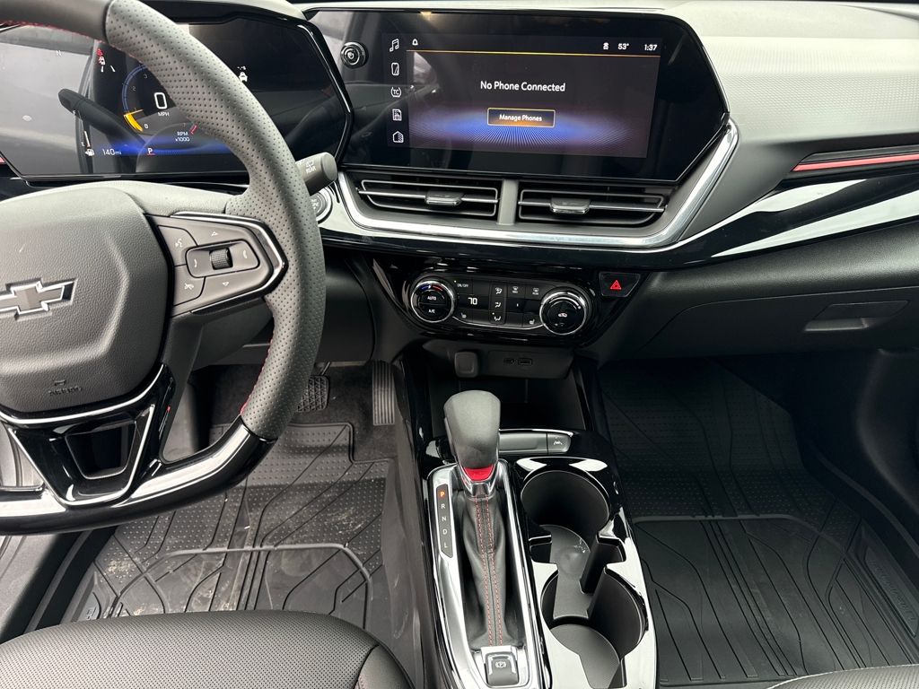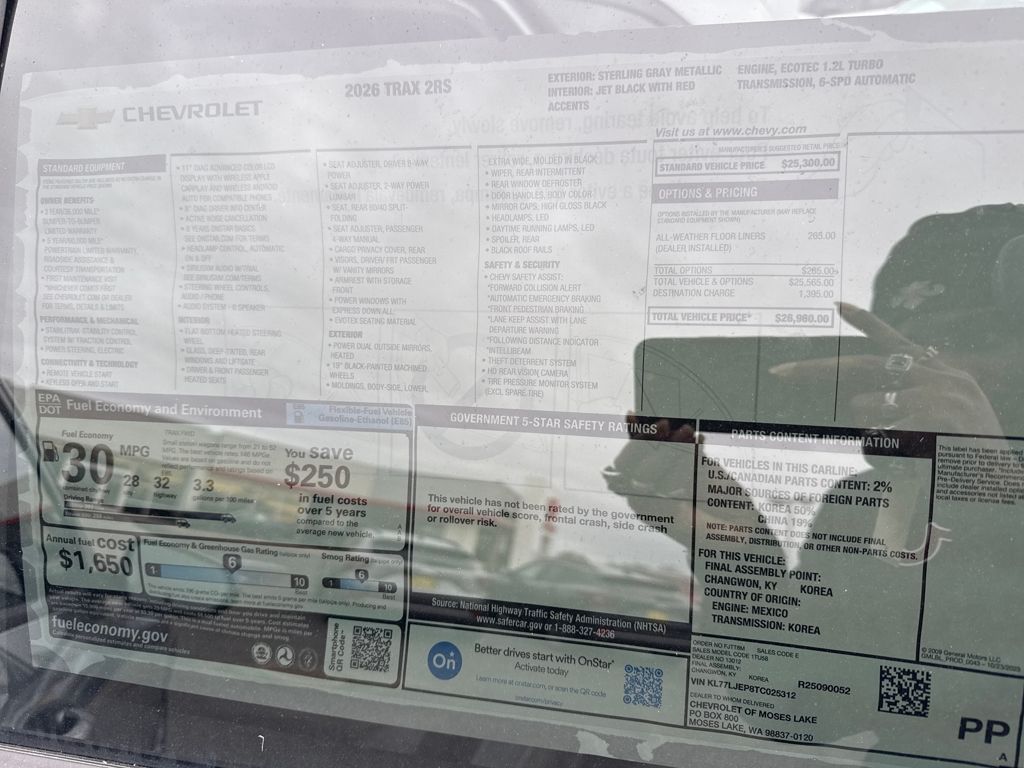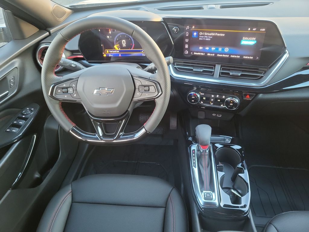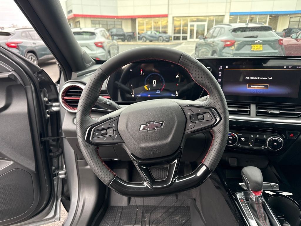 Sterling Gray Metallic 2026 Chevrolet Trax 2RS FWD 6-Speed Automatic ECOTEC 1.2L Turbo 2-Way Adjustable Front Head Restraints, 2-Way Power Driver Lumbar Seat Adjuster, 3.50 Final Drive Axle Ratio, 4-Way Manual Front Passenger Seat Adjuster, 4-Wheel Disc Brakes, 6 Speakers, 6-Speaker Audio System Feature, 8-Way Power Driver Seat Adjuster, ABS brakes, Air Conditioning, Alloy wheels, AM/FM radio: SiriusXM, Auto High-beam Headlights, Automatic temperature control, Brake assist, Bumpers: body-color, Compass, Delay-off headlights, Driver door bin, Driver vanity mirror, Dual front impact airbags, Dual front side impact airbags, Electronic Stability Control, Emergency communication system: OnStar One Essentials, Evotex Seat Trim, Exterior Parking Camera Rear, Front and Rear Jet Black All-Weather Floor Liners, Front anti-roll bar, Front Bucket Seats, Front Center Armrest, Front reading lights, Front wheel independent suspension, Fully automatic headlights, Heated door mirrors, Heated Driver and Front Passenger Seats, Heated front seats, Heated steering wheel, Illuminated entry, Leather steering wheel, License Plate Front Mounting Package, Low tire pressure warning, Occupant sensing airbag, Outside temperature display, Overhead airbag, Overhead console, Panic alarm, Passenger door bin, Passenger vanity mirror, Power door mirrors, Power driver seat, Power steering, Power windows, Preferred Equipment Group 2RS, Premium audio system: Chevrolet Infotainment 3, Radio data system, Radio: AM/FM Stereo Audio System, Rear window defroster, Rear window wiper, Remote keyless entry, Security system, SiriusXM Trial Subscription, Speed control, Split folding rear seat, Spoiler, Sport steering wheel, Steering wheel mounted audio controls, Tachometer, Telescoping steering wheel, Tilt steering wheel, Traction control, Trip computer, Variably intermittent wipers, Wheels: 19 Black-Painted Machined Aluminum, Wireless Apple CarPlay/Wireless Android Auto.28/32 City/Highway MPG