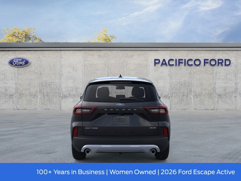 2026 Ford Escape Agate Black Metallic Active AWD. AWD 8-Speed Automatic 1.5L EcoBoostPacifico Ford is proud to present you with another great new Ford. This 2026 Ford Escape Active is loaded with the following Factory Options:Equipment Group 200A (3.81 Axle Ratio, 4-Way Manual Front Passenger Seat, 6-Way Manual Driver Seat, Ford App, Radio: AM/FM Stereo with SiriusXM 360L, SYNC 4, Unique Cloth Front Bucket Seats, and Wheels: 17 Shadow Silver-Painted Aluminum), AWD, 4-Wheel Disc Brakes, 6 Speakers, ABS brakes, Air Conditioning, Alloy wheels, AM/FM radio: SiriusXM 360L, Auto High-beam Headlights, Automatic temperature control, Brake assist, Bumpers: body-color, Compass, Delay-off headlights, Driver door bin, Driver vanity mirror, Dual front impact airbags, Dual front side impact airbags, Electronic Stability Control, Emergency communication system: SYNC 4 911 Assist, Four wheel independent suspension, Front and Rear Floor Liners Without Carpet Mats, Front anti-roll bar, Front Bucket Seats, Front Center Armrest, Front dual zone A/C, Front License Plate Bracket, Front reading lights, Fully automatic headlights, Illuminated entry, Knee airbag, Low tire pressure warning, Occupant sensing airbag, Outside temperature display, Overhead airbag, Overhead console, Panic alarm, Passenger door bin, Passenger vanity mirror, Power door mirrors, Power steering, Power windows, Radio data system, Rear anti-roll bar, Rear reading lights, Rear seat center armrest, Rear window defroster, Rear window wiper, Remote keyless entry, Speed control, Speed-sensing steering, Speed-Sensitive Wipers, Split folding rear seat, Spoiler, Steering wheel mounted audio controls, Tachometer, Telescoping steering wheel, Tilt steering wheel, Traction control, Trip computer, and Variably intermittent wipers.26/32 City/Highway MPGFord Express Buyiing A completely new way to buy a car!! One price instantly, buy 100% online Home delivery avaialble. Price includes: $2000 - Bonus Customer Cash. Exp. 03/31/2026 $500 - Retail Customer Cash. Exp. 03/31/2026