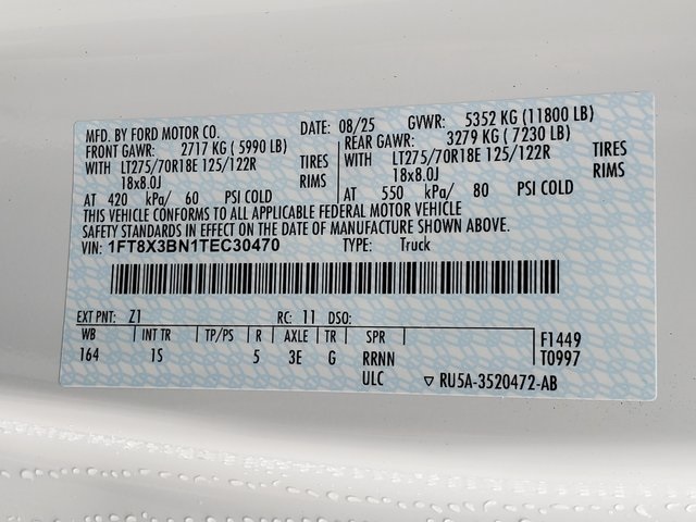 F35D 4X4 SUPERCAB PICKUP/164 2026 MODEL YEAR Z1 OXFORD WHITE 1S MEDIUM DARK SLATE CLOTH PREFERRED EQUIPMENT PKG.610A .XL TRIM 572 .AIR CONDITIONING -- CFC FREE .AM/FM STEREO MP3/CLK 99N 7.3L DEVCT NA PFI V8 ENGINE 44G 10-SPEED AUTO TORQSHIFT X3E 3.73 ELECTRONIC-LOCKING AXLE JOB #1 ORDER 153 FRONT LICENSE PLATE BRACKET 17S STX APPEARANCE PACKAGE .LT275/70R18E BSW ALL TERRAIN .EBONY BLACK ALUM WHLS-18 .CLOTH 40/20/40 SEAT 17X FX4 OFF-ROAD PACKAGE .SKID PLATES 18B PLATFORM RUNNING BOARDS 11800# GVWR PACKAGE 425 50 STATE EMISSIONS BACKGLASS DEFROST 435 POWER SLIDING REAR WINDOW 473 SNOW PLOW PREP PACKAGE BLIS (BLIND SPOT INFO SYSTEM) JACK 66L LED BOX LIGHTING 66S UPFITTER SWITCHES 67B 410 AMP DUAL ALTERNATOR REAR PARKING SENSORS 76S REMOTE START SYSTEM 86M DUAL BATTERY 874 360-DEGREE CAMERA PACKAGE 924 PRIVACY GLASS CONN PKG: 1 YR INCL W/FORD APP 96D XL DRIVER ASSIST PACKAGE