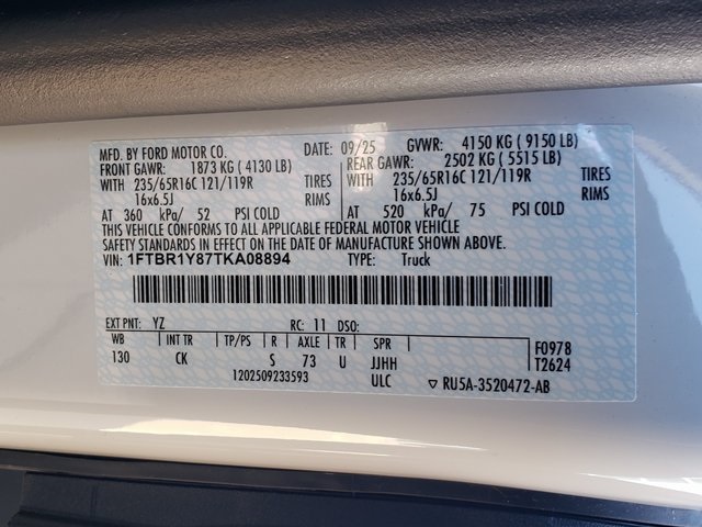R1YH T250 LR CARGO RWD 130 WHEELBASE 2026 MODEL YEAR YZ OXFORD WHITE CK DARK PALAZZO GRAY CLOTH PREFERRED EQUIPMENT PKG.101A .XL TRIM 998 3.5L PFDI V6 (GAS) 44U .10-SPEED TRANSMISSION TC8 .235/65R16C BSW ALL-SEASON X73 3.73 NON-LIMITED SLIP AXLE JOB #1 ORDER 153 FRONT LICENSE PLATE BRACKET 20H 9150# GVWR PACKAGE 21L 2WAY DRV/PASS PALAZZO CLOTH 425 50 STATE EMISSIONS 59A CONN PKG: 1 YR INCL W/FORD APP