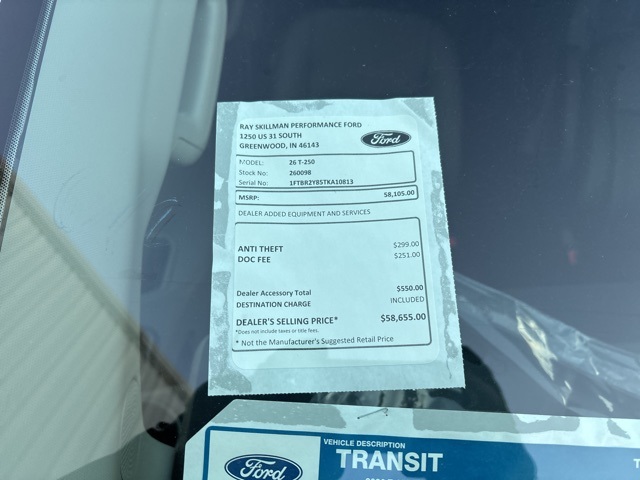 2026 Ford Transit-250 Oxford White AWD 10-Speed Automatic with Overdrive 3.5L V6 Flex FuelWHY BUY FROM US? Since first opening our doors, Ray Skillman Ford has been proud to serve Indianapolis, Greenwood and Franklin drivers. Our firm commitment to top-notch customer service has situated us as a leading area Ford dealer, and this is what keeps our customers coming back time and again. We offer a wide selection of vehicles and are excited to help you find a car that's tailored to your specific needs.Call or text 317-885-9800 to schedule your test drive today! All offers shown do not include tax, title, $251 doc/compliance fee, and $299 theft charge . Price includes the following rebates. Not all customers qualify for all rebates:$2500 - Retail Customer Cash. Exp. 03/31/2026